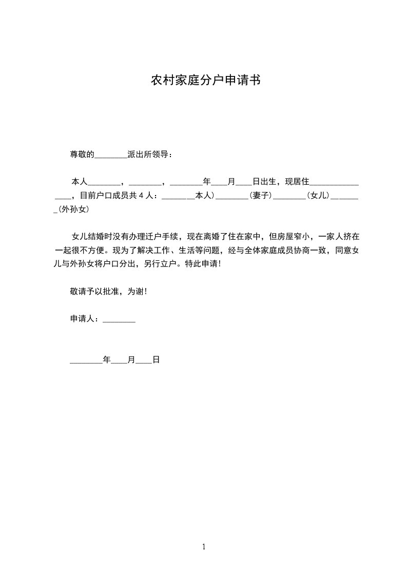 甲、乙双方因[具体分户原因],申请从原家庭分户独立生活。