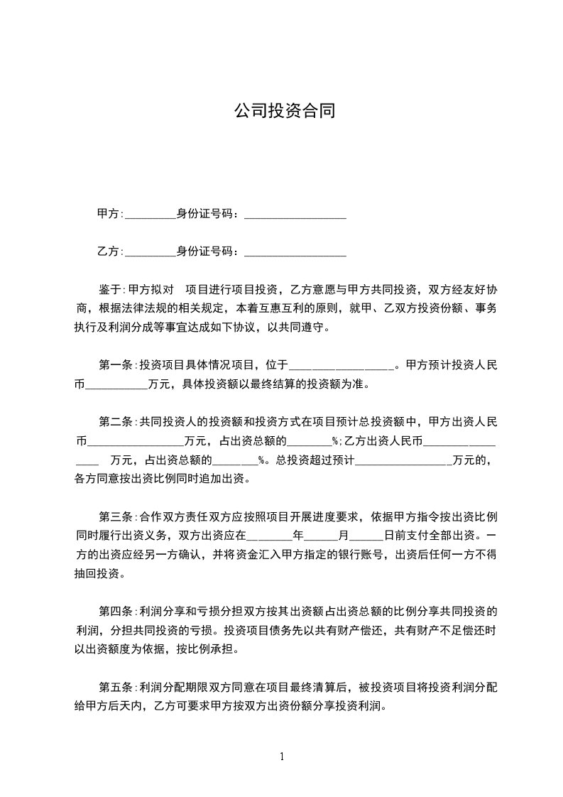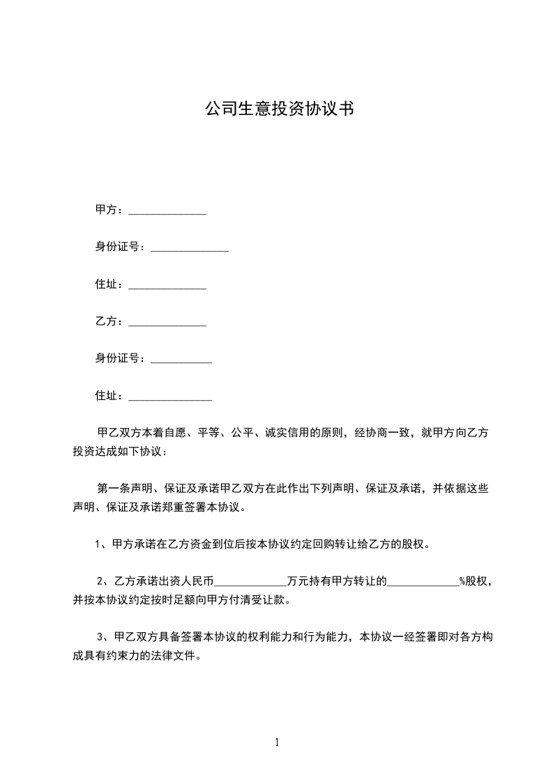 甲乙双方本着自愿、平等、公平、诚实信用的原则,经协商一致,就甲方向乙方投资达成如下协议: