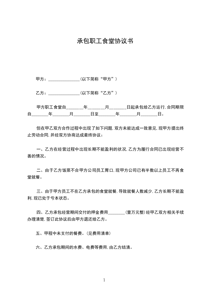 九、甲乙双方于________年________月________日前,一次性结清所有款项,乙方搬离职工食堂,并将食堂退还给甲方,承包经营合同于________年________月________日解除。