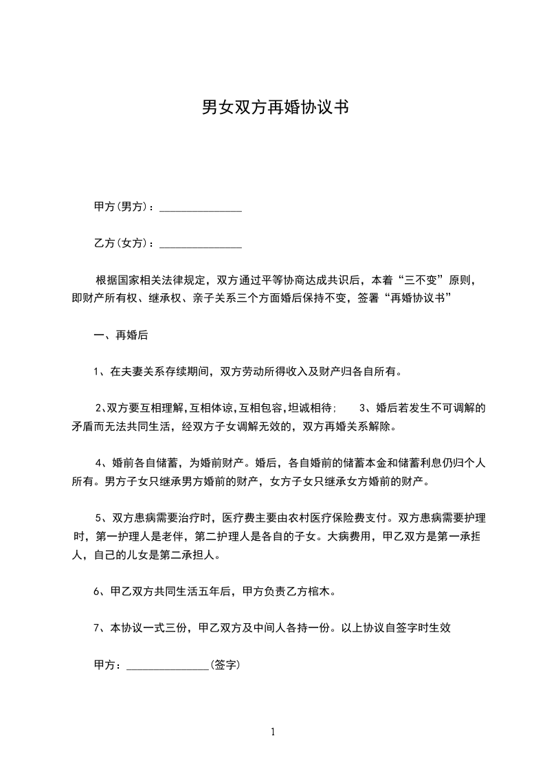 根据国家相关法律规定,双方通过平等协商达成共识后,本着“三不变”原则,即财产所有权、继承权、亲子关系三个方面婚后保持不变,签署“再婚协议书”
