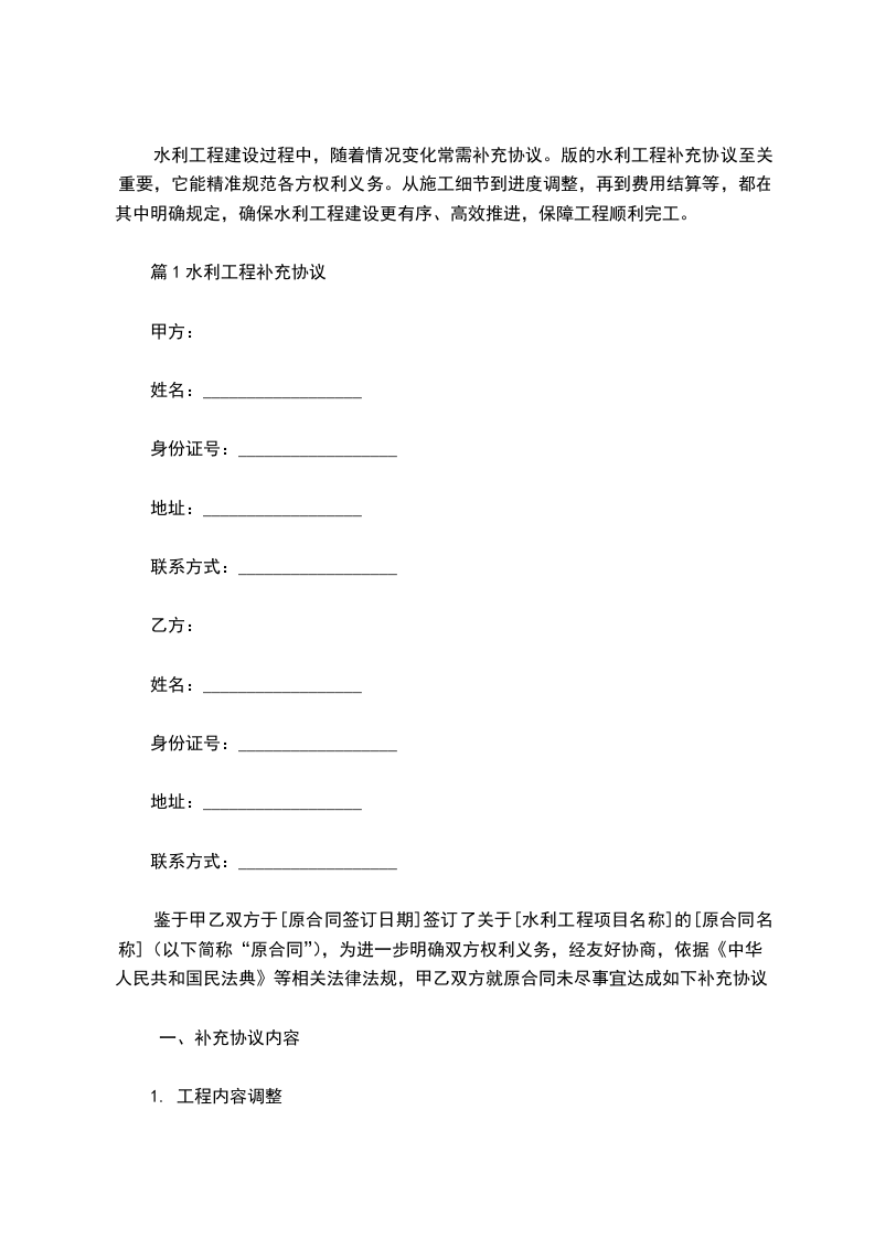 鉴于甲乙双方于[原供水合同签订日期]签订了《供水合同》(合同编号:[原合同编号]),为进一步明确双方权利义务,经友好协商,依据《中华人民共和国民法典》等相关法律法规,就供水合同相关事宜达成如下补充协议: