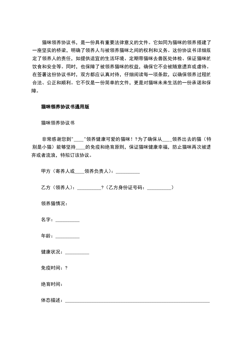 鉴于乙方拥有一只猫咪,愿意将其领养给甲方,双方经友好协商,达成以下领养协议: