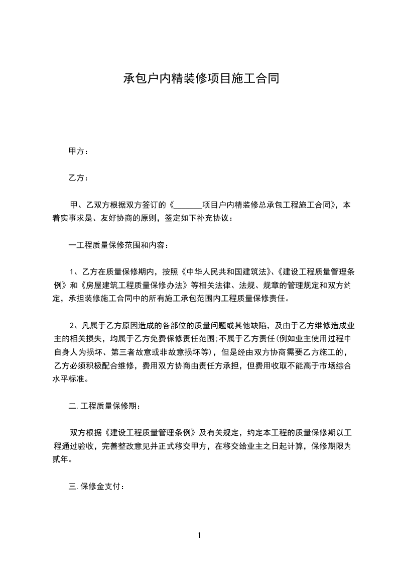 甲、乙双方根据双方签订的《_______项目户内精装修总承包工程施工合同》,本着实事求是、友好协商的原则,签定如下补充协议: