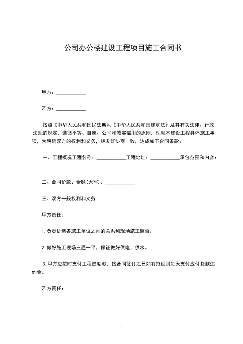 按照《中华人民共和国民法典》、《中华人民共和国建筑法》及其有关法律、行政法规的规定,遵循平等、自愿、公平和诚实信用的原则,现就本建设工程具体施工事项,为明确双方的权利和义务,经友好协商一致,达成如下合同条款: