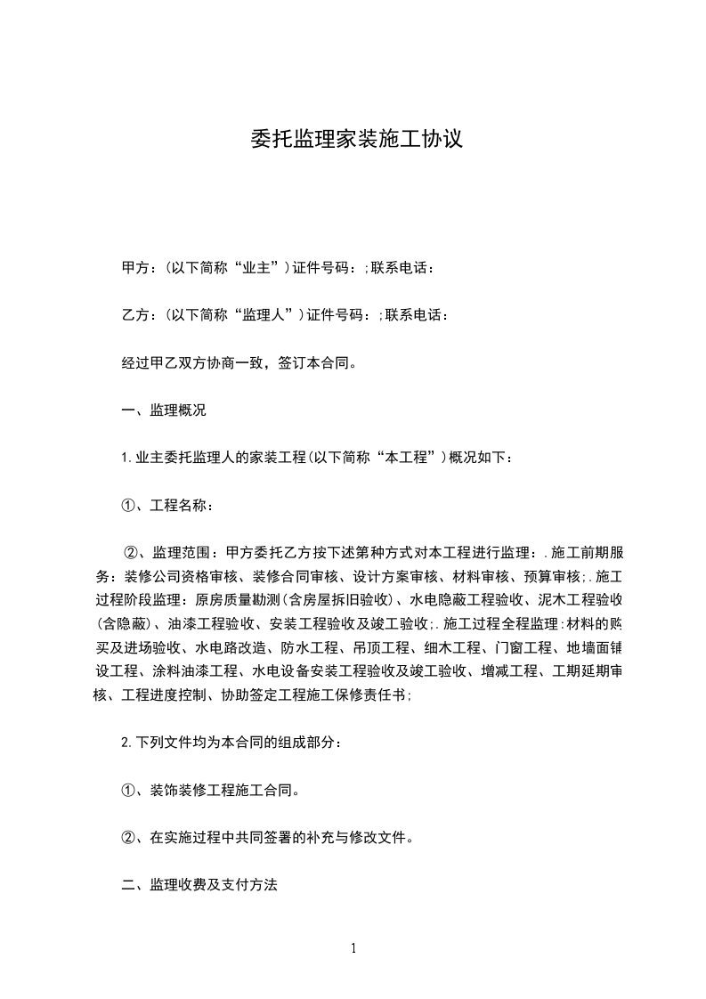 ②、监理范围:甲方委托乙方按下述第种方式对本工程进行监理:.施工前期服务:装修公司资格审核、装修合同审核、设计方案审核、材料审核、预算审核;.施工过程阶段监理:原房质量勘测(含房屋拆旧验收)、水电隐蔽工程验收、泥木工程验收(含隐蔽)、油漆工程验收、安装工程验收及竣工验收;.施工过程全程监理:材料的购买及进场验收、水电路改造、防水工程、吊顶工程、细木工程、门窗工程、地墙面铺设工程、涂料油漆工程、水电设备安装工程验收及竣工验收、增减工程、工期延期审核、工程进度控制、协助签定工程施工保修责任书;