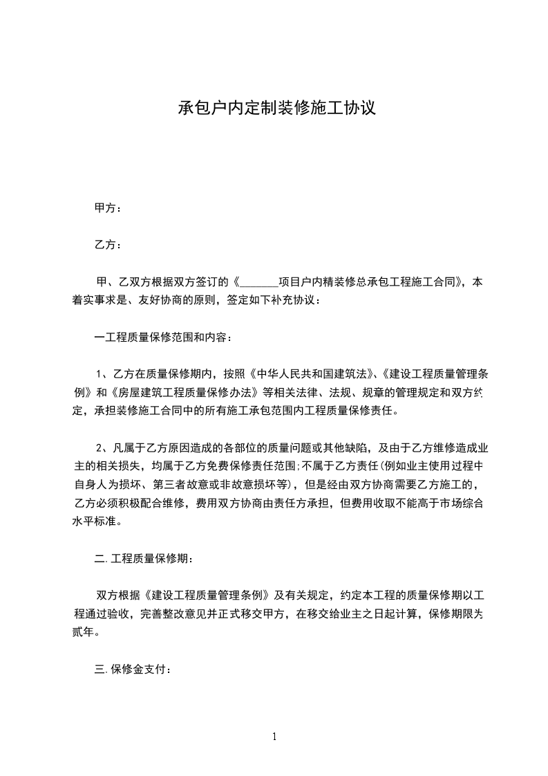 1、乙方在质量保修期内,按照《中华人民共和国建筑法》、《建设工程质量管理条例》和《房屋建筑工程质量保修办法》等相关法律、法规、规章的管理规定和双方约定,承担装修施工合同中的所有施工承包范围内工程质量保修责任。