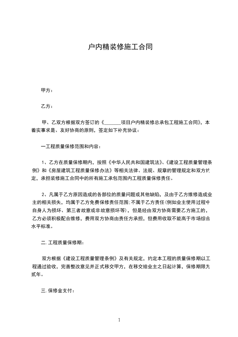 甲、乙双方根据双方签订的《_______项目户内精装修总承包工程施工合同》,本着实事求是、友好协商的原则,签定如下补充协议:
