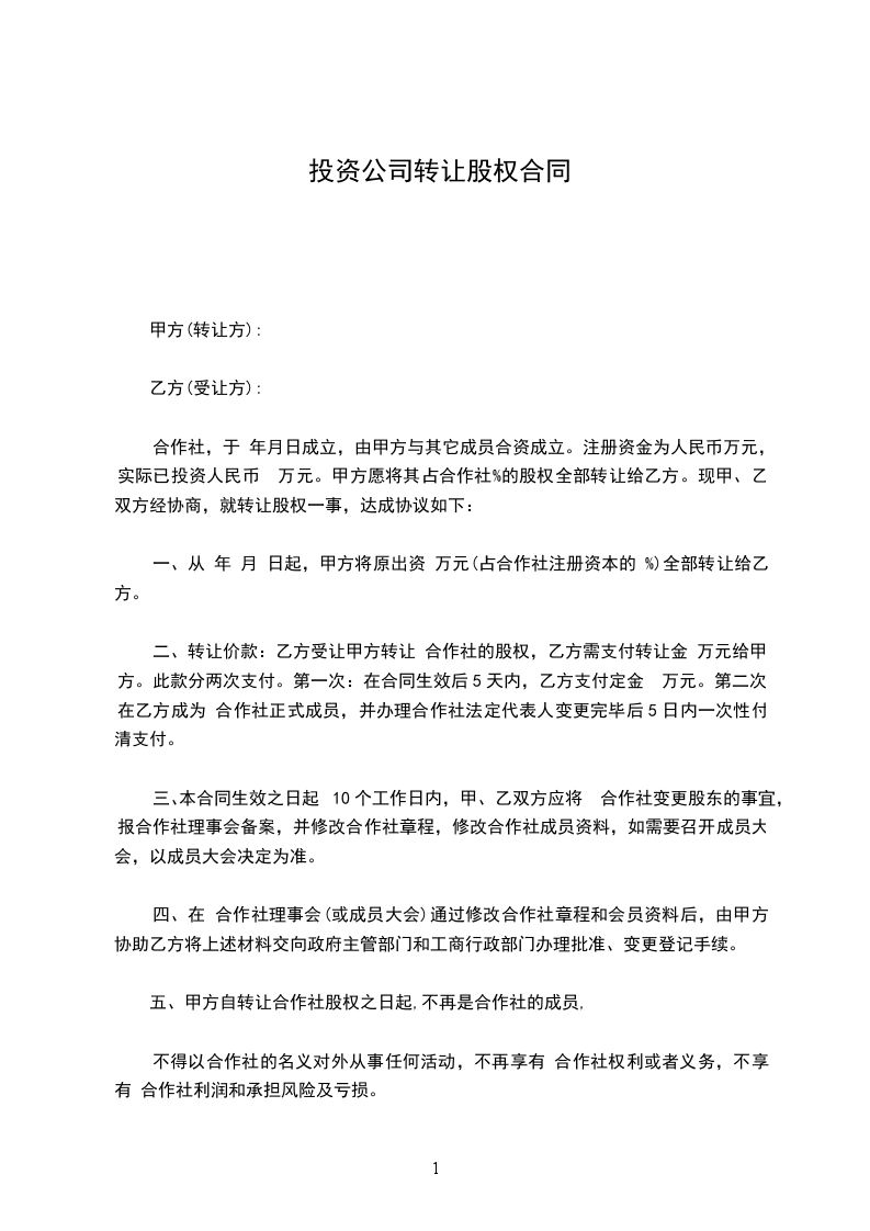1. 双方应在甲方支付全部投资款后的______个工作日内,共同向公司登记机关申请办理股权变更登记手续,将甲方登记为公司股东。