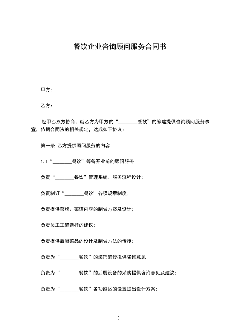 1. 乙方为甲方提供餐饮管理方面的专业顾问服务,包括但不限于餐厅运营管理、菜品研发与优化、人员培训与管理、成本控制与预算管理等方面的咨询与建议。