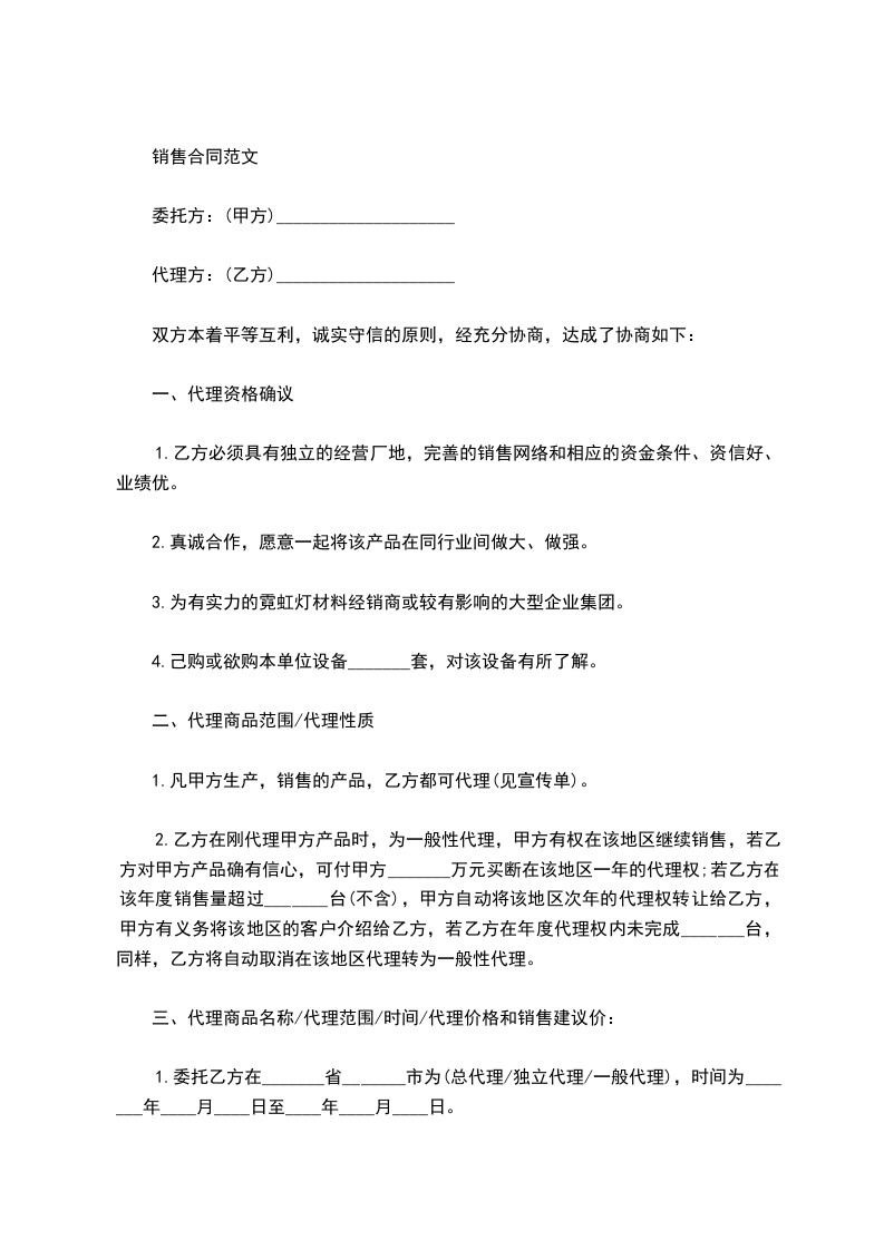 2.乙方在刚代理甲方产品时,为一般性代理,甲方有权在该地区继续销售,若乙方对甲方产品确有信心,可付甲方_______万元买断在该地区一年的代理权;若乙方在该年度销售量超过_______台(不含),甲方自动将该地区次年的代理权转让给乙方,甲方有义务将该地区的客户介绍给乙方,若乙方在年度代理权内未完成_______台,同样,乙方将自动取消在该地区代理转为一般性代理。