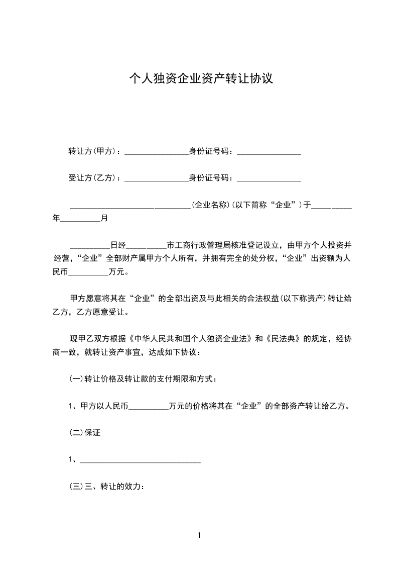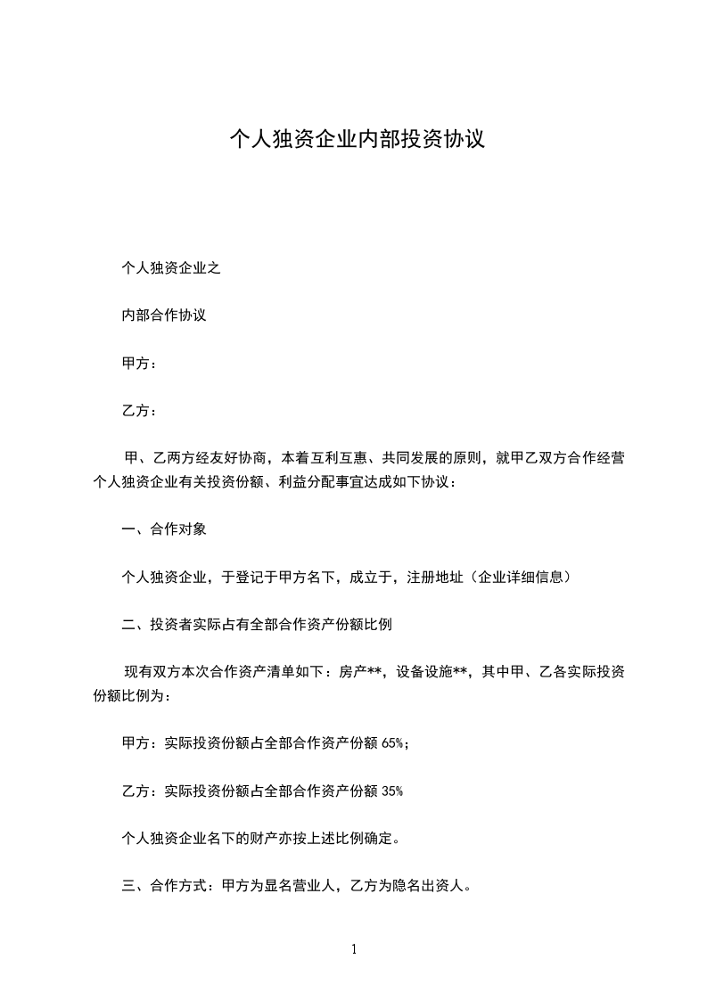 1. 甲乙双方共同投资设立个人独资企业,总投资额为人民币______元。