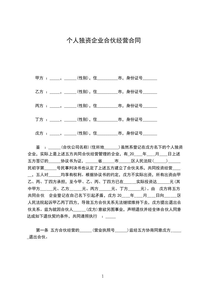 篇1个人独资企业合伙协议