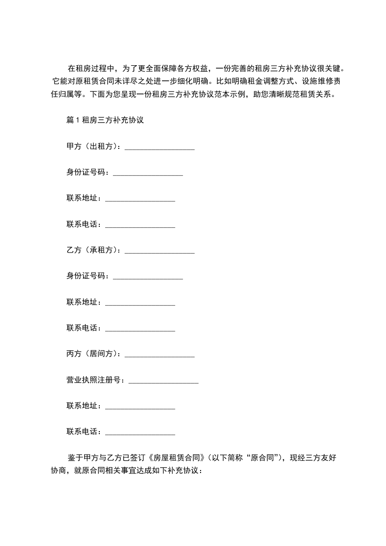 鉴于甲乙双方于____年__月__日签订了《房屋租赁合同》(以下简称“原合同”),现经双方友好协商,就乙方扩租甲方房屋事宜达成如下补充协议:
