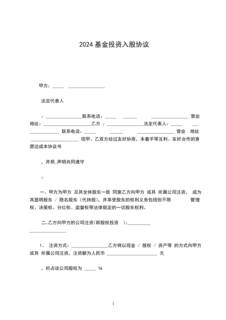1. 甲方以人民币______元整(大写______元整)作为投资款投入乙方,占乙方注册资本的______%。