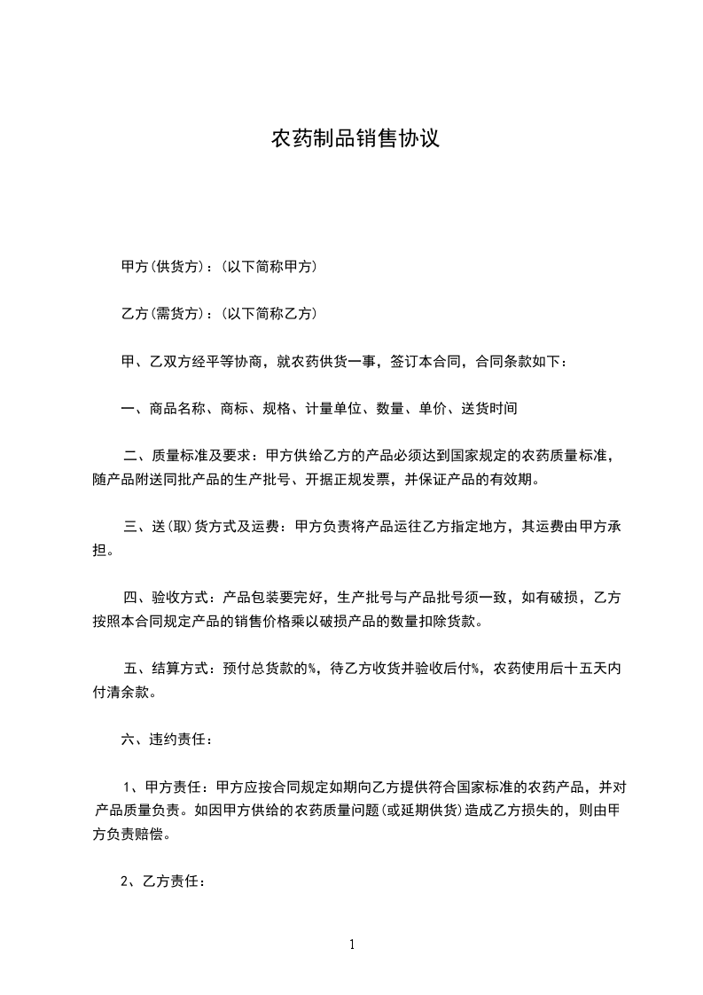 1、甲方责任:甲方应按合同规定如期向乙方提供符合国家标准的农药产品,并对产品质量负责。如因甲方供给的农药质量问题(或延期供货)造成乙方损失的,则由甲方负责赔偿。