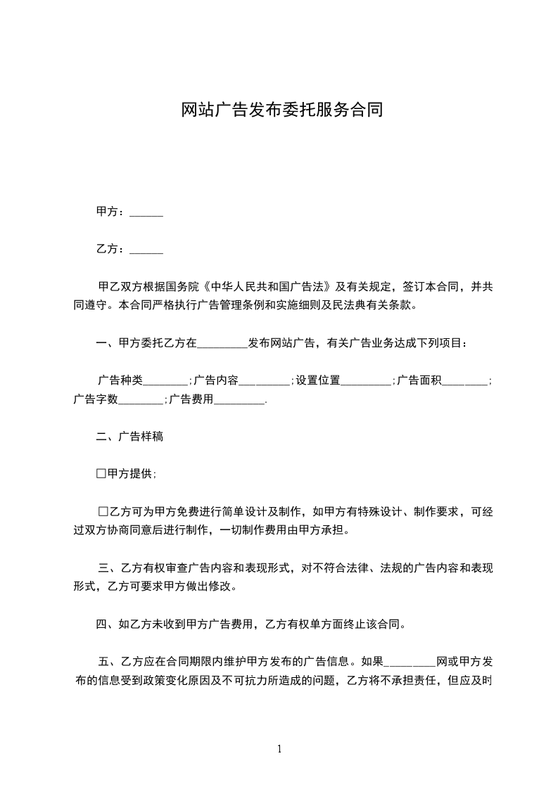 1、价格和折扣甲方在乙方网站广告投放时间_____年_____月_____日至_____年_____月_____日网站首面横幅:投放时间_____年_____月_____日至_____年_____月_____日价格为:元/周__10天共计:元