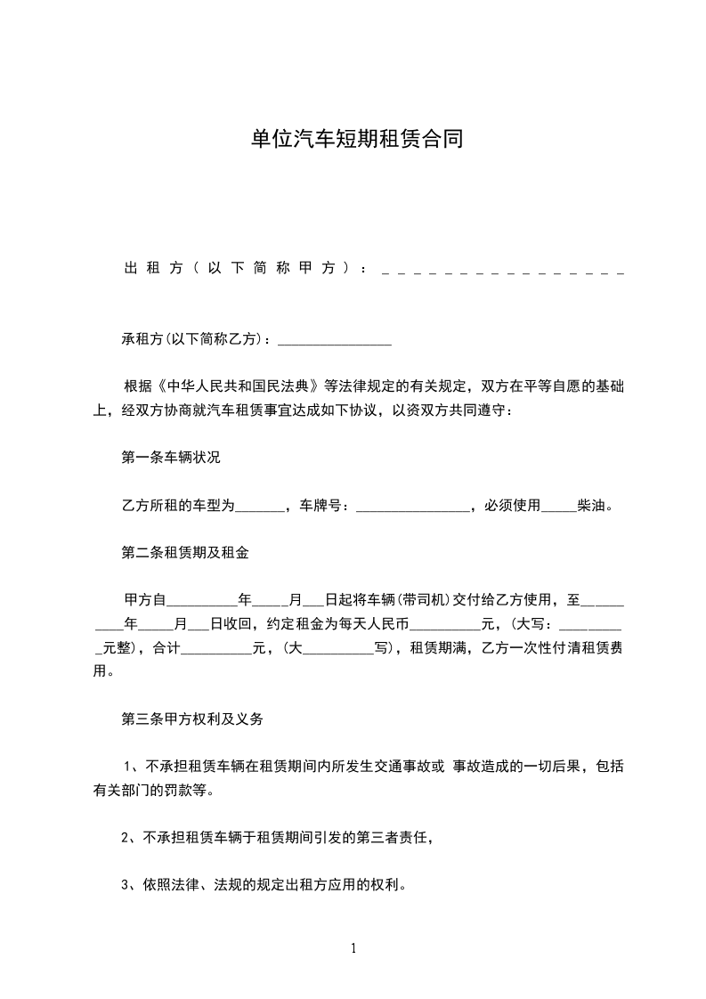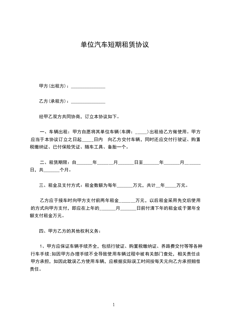 汽车短期租赁合同书