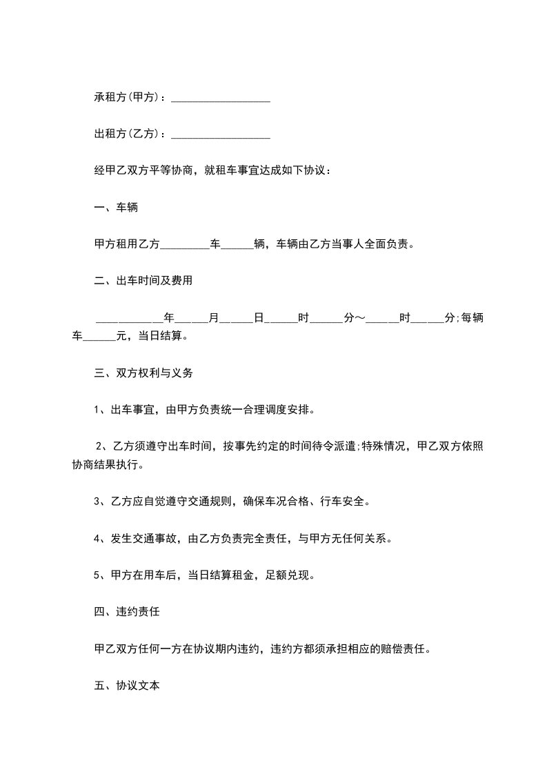 一、出租方根据承租方需要,同意将____牌汽车____辆租给承租方使用,经双方协商订立如下条款。