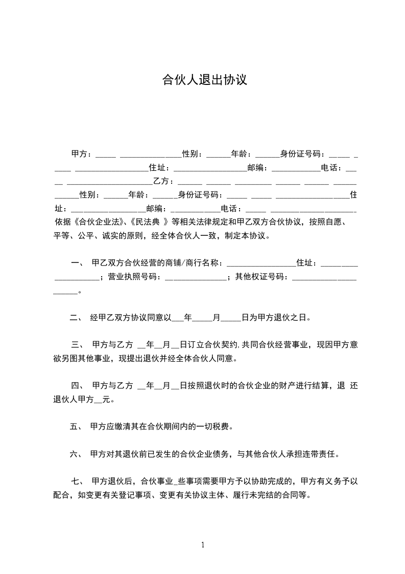 1. 乙方自愿退出[公司名称]的合伙经营,甲方同意乙方退出。