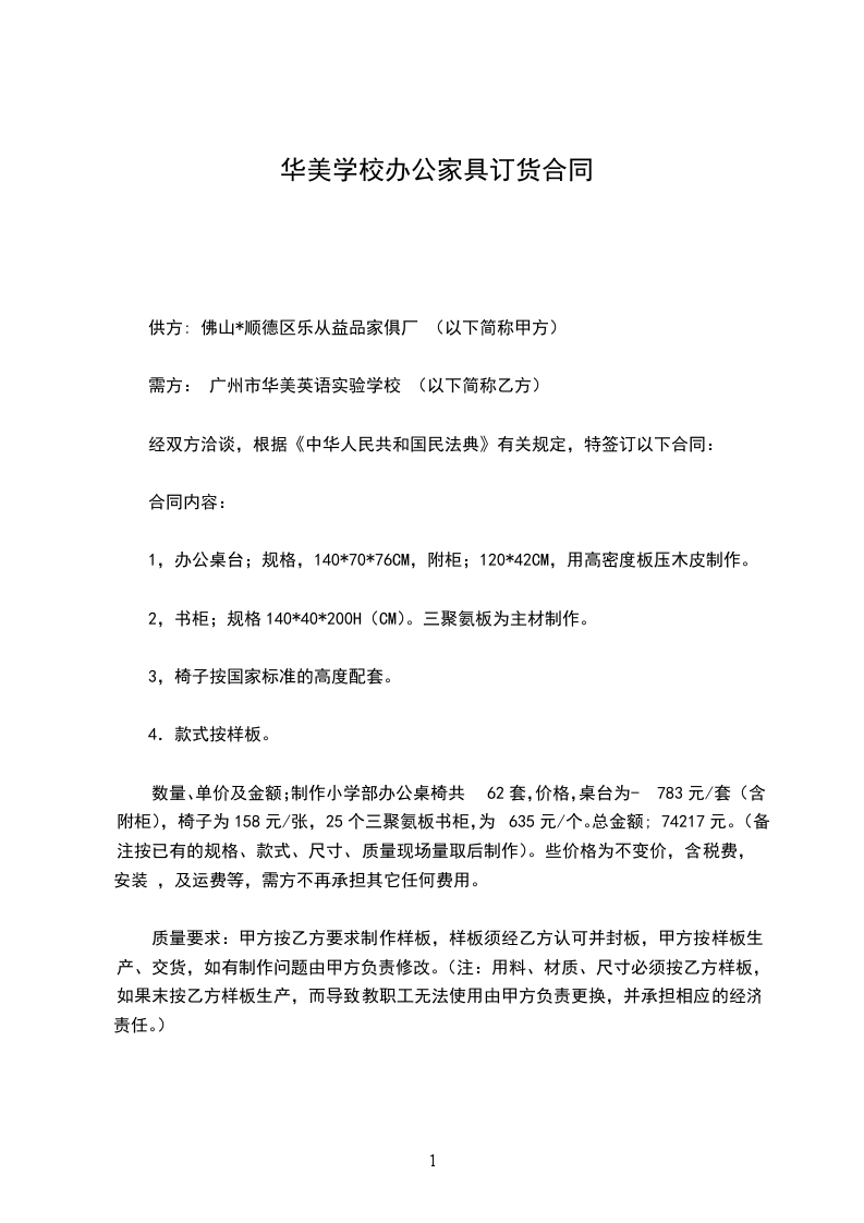 甲方:广东顺德市*品傢俱厂 乙方:广州市华美英语实验学校