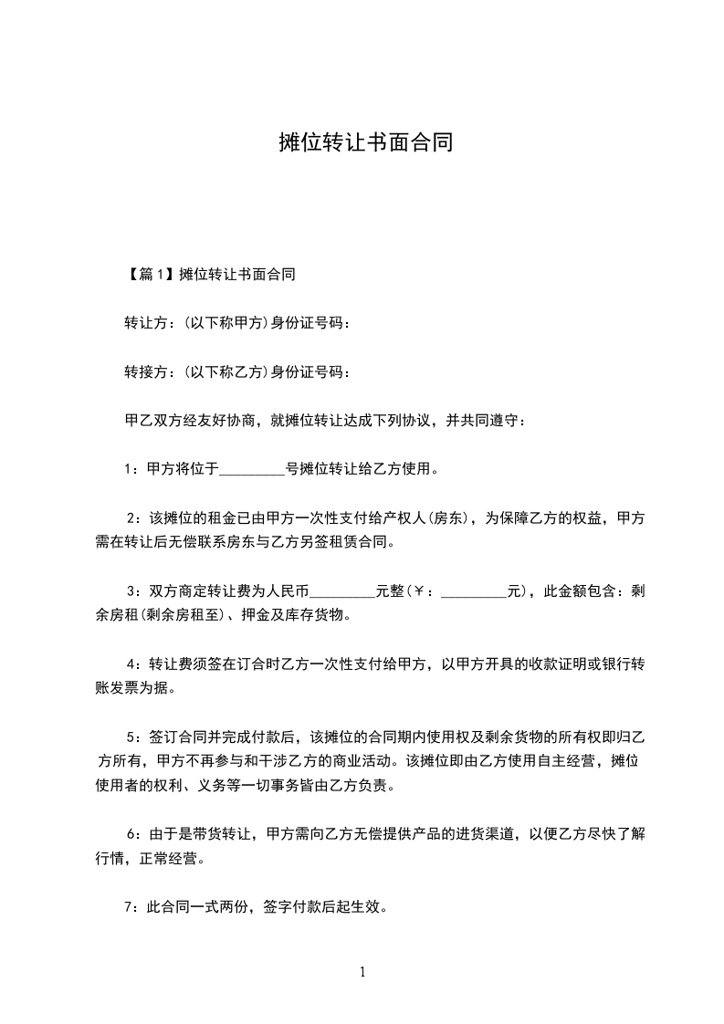 1. 甲方转让给乙方的摊位位于__________________(具体地址),摊位面积为______平方米。
