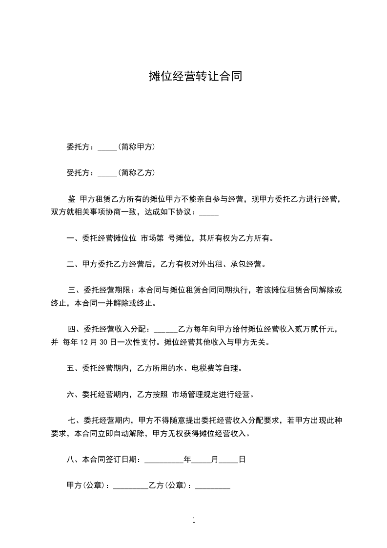 1. 甲方转让给乙方的摊位位于__________________(具体地址),摊位面积为______平方米。