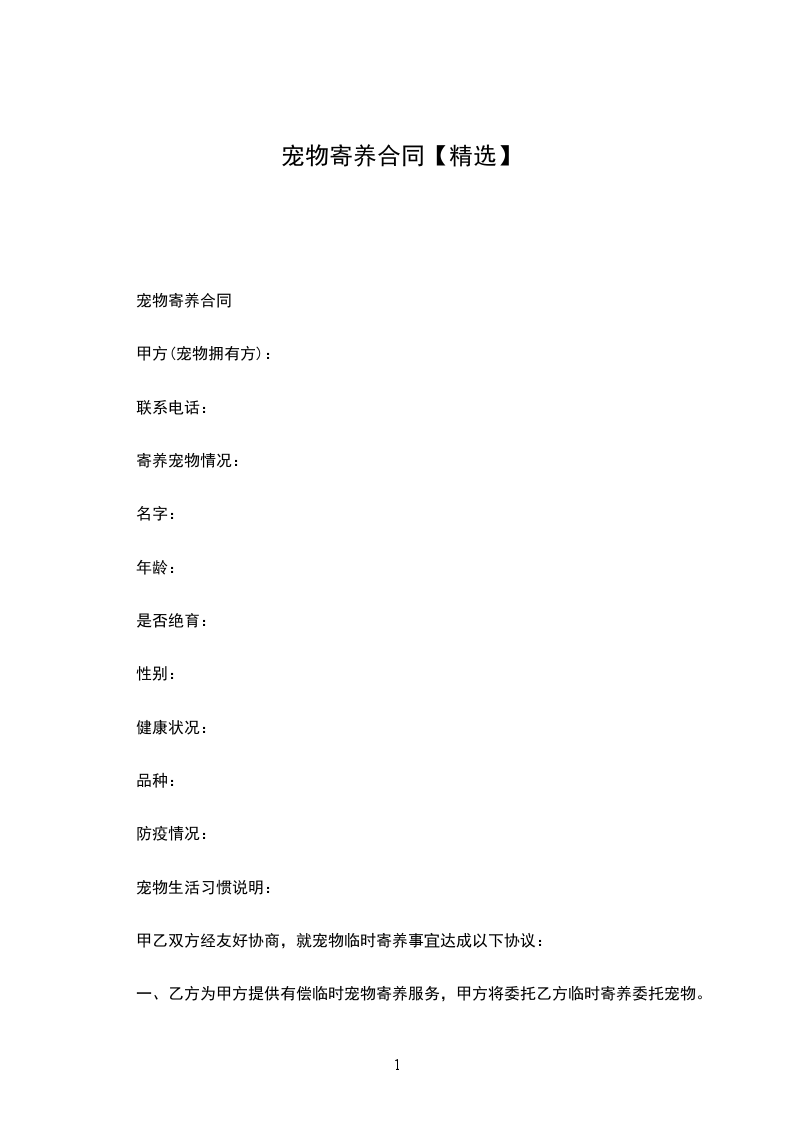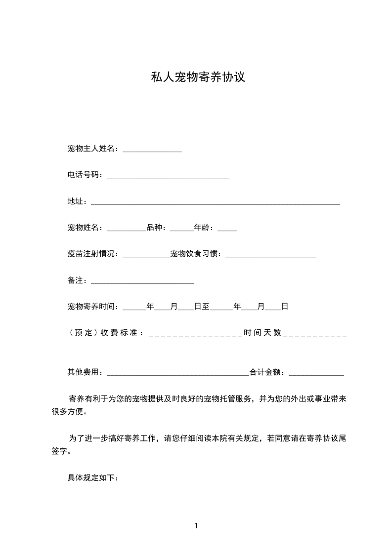 1. 乙方提供安全、卫生、舒适的寄养环境,保证宠物的饮食、饮水供应。