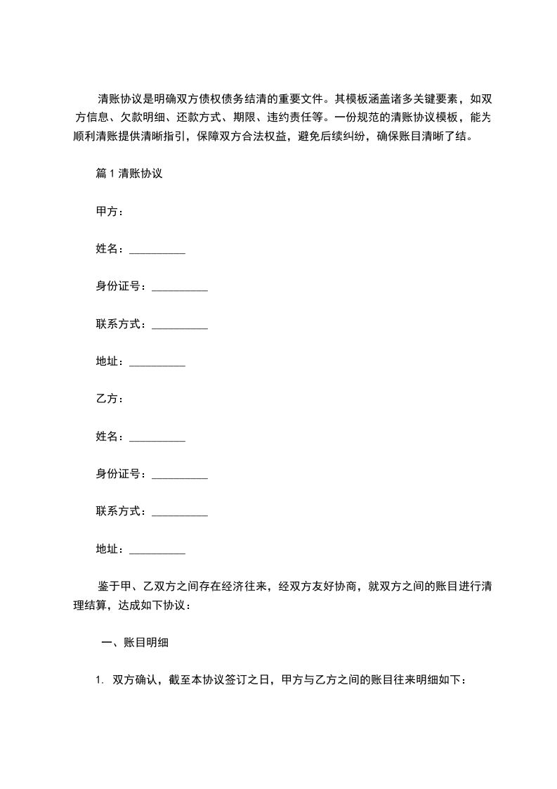 鉴于甲乙双方之间存在[具体业务往来简述],现经双方友好协商,就双方之间的账目结算事宜达成如下清账协议: