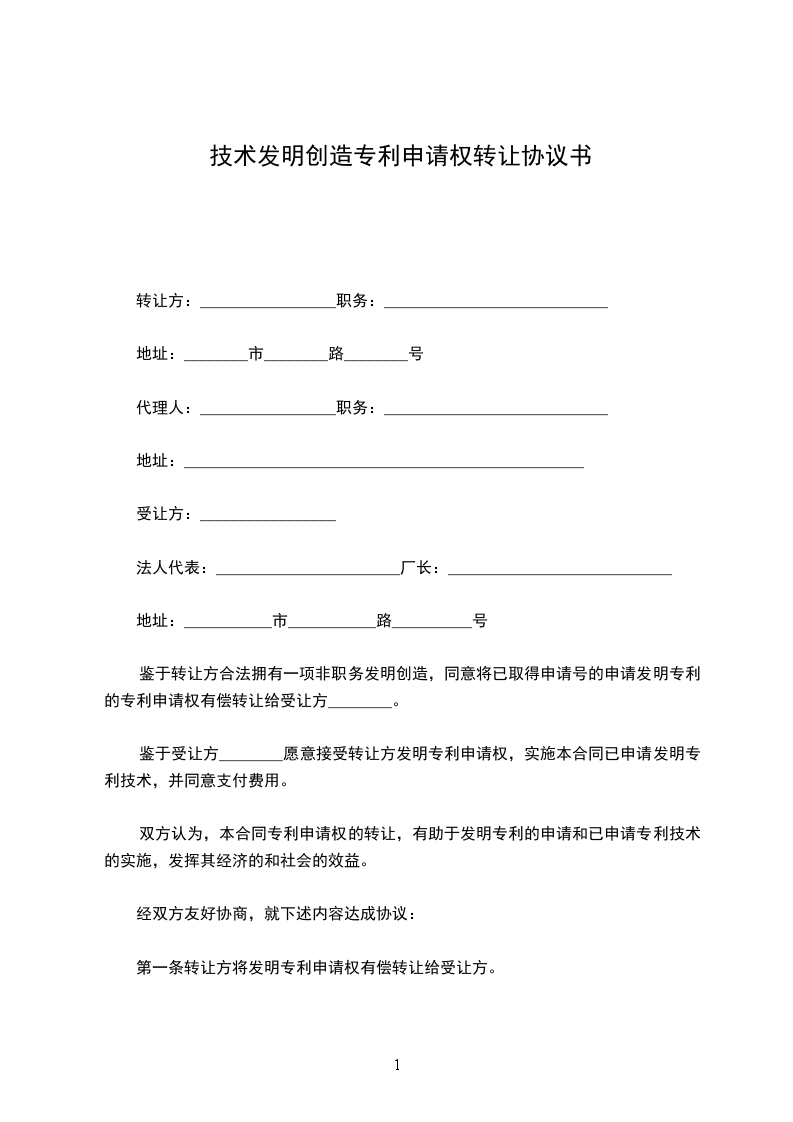 第一条转让方将发明专利申请权有偿转让给受让方。