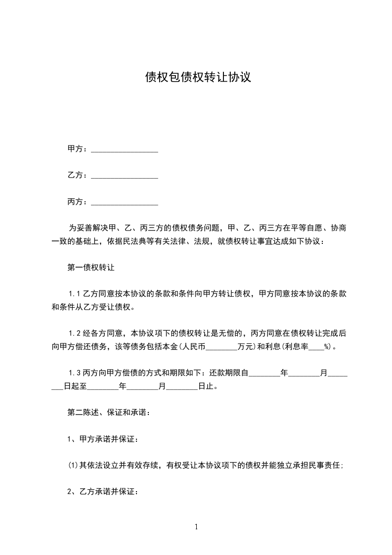 1.2经各方同意,本协议项下的债权转让是无偿的,丙方同意在债权转让完成后向甲方偿还债务,该等债务包括本金(人民币________万元)和利息(利息率____%)。