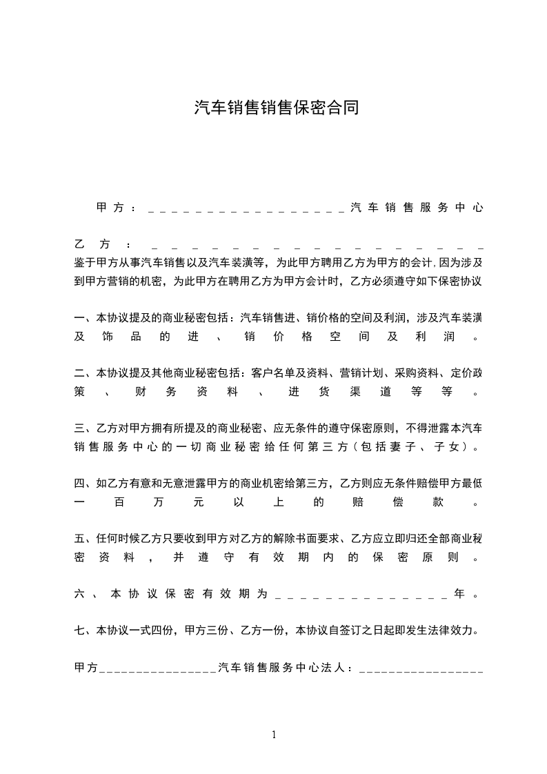 甲方:_________________汽车销售服务中心 乙方:_________________ 鉴于甲方从事汽车销售以及汽车装潢等,为此甲方聘用乙方为甲方的会计,因为涉及到甲方营销的机密,为此甲方在聘用乙方为甲方会计时,乙方必须遵守如下保密协议: 一、本协议提及的商业秘密包括:汽车销售进、销价格的空间及利润,涉及汽车装潢及饰品的进、销价格空间及利润。 二、本协议提及其他商业秘密包括:客户名单及资料、营销计划、采购资料、定价政策、财务资料、进货渠道等等。 三、乙方对甲方拥有所提及的商业秘密、应无条件的遵守保密原则,不得泄露本汽车销售服务中心的一切商业秘密给任何第三方(包括妻子、子女)。 四、如乙方有意和无意泄露甲方的商业机密给第三方,乙方则应无条件赔偿甲方最低一百万元以上的赔偿款。 五、任何时候乙方只要收到甲方对乙方的解除书面要求、乙方应立即归还全部商业秘密资料,并遵守有效期内的保密原则。 六、本协议保密有效期为______________年。 七、本协议一式四份,甲方三份、乙方一份,本协议自签订之日起即发生法律效力。 甲方________________汽车销售服务中心法人:_________________ 乙方:_________________