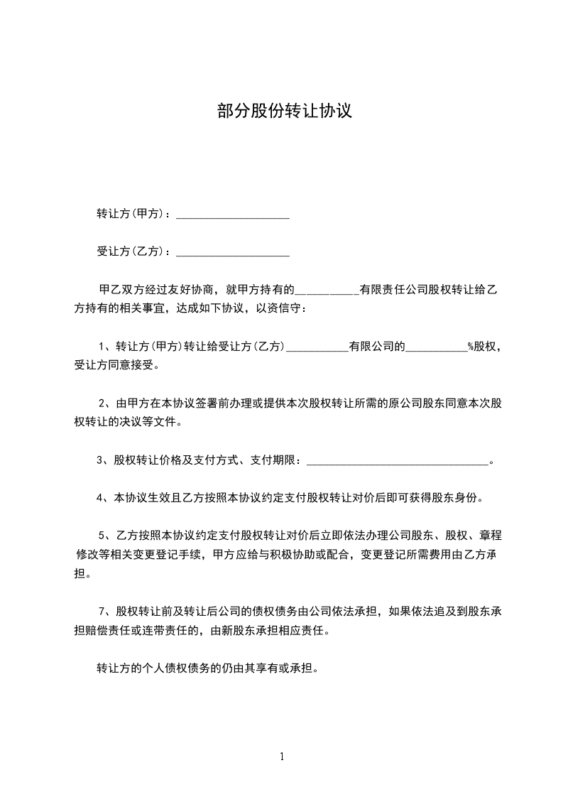 1、转让方(甲方)转让给受让方(乙方)___________有限公司的___________%股权,受让方同意接受。
