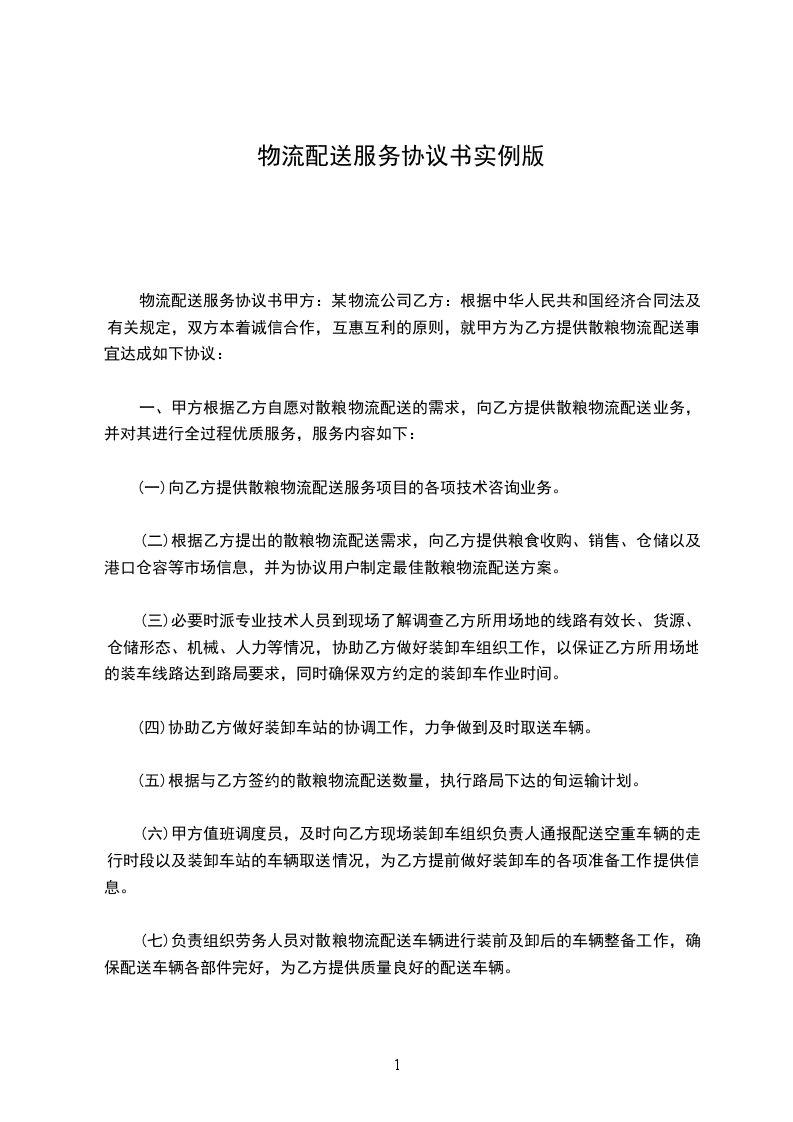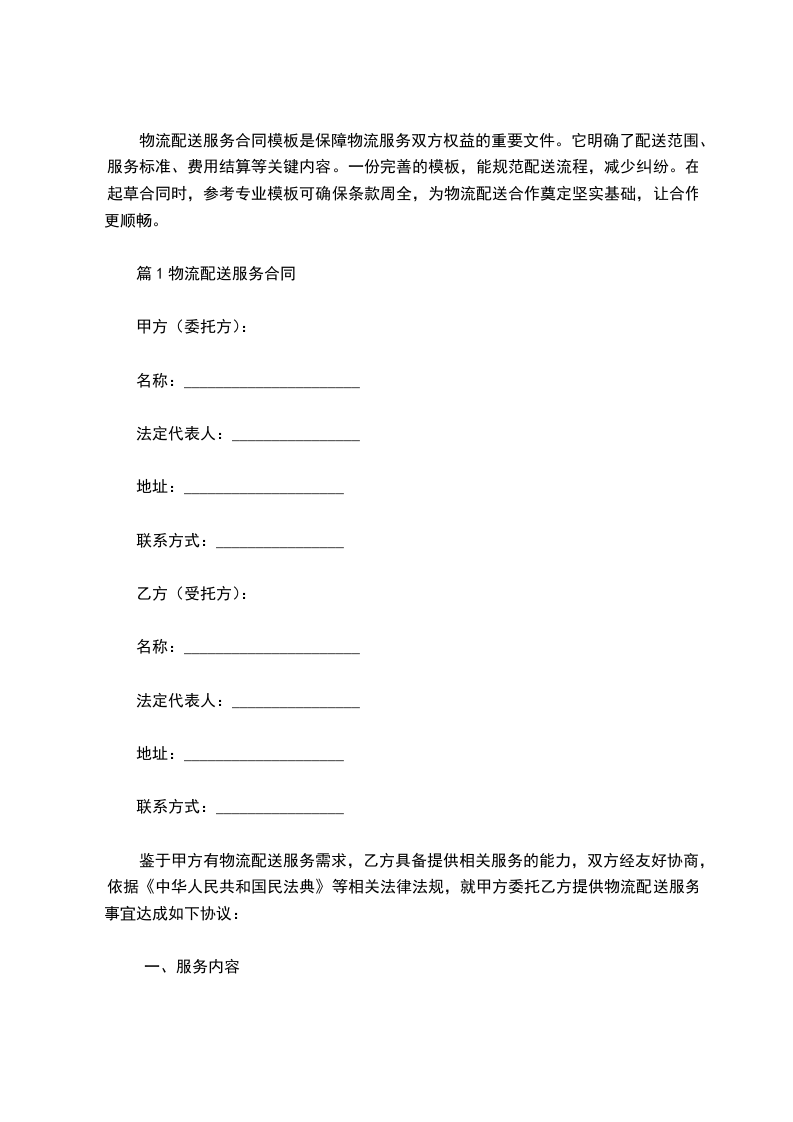 1. 物流配送服务费用为人民币______元(大写______元整)。此费用包含运输费、装卸费、保险费等乙方完成本合同约定服务所需的一切费用。