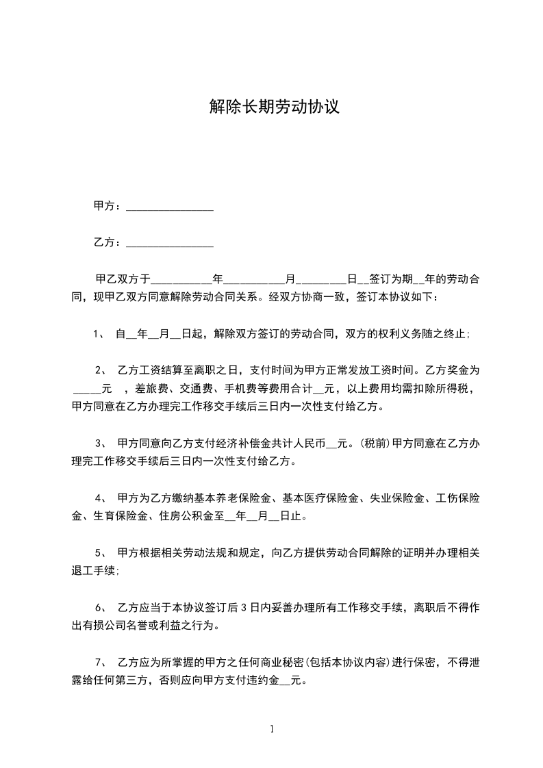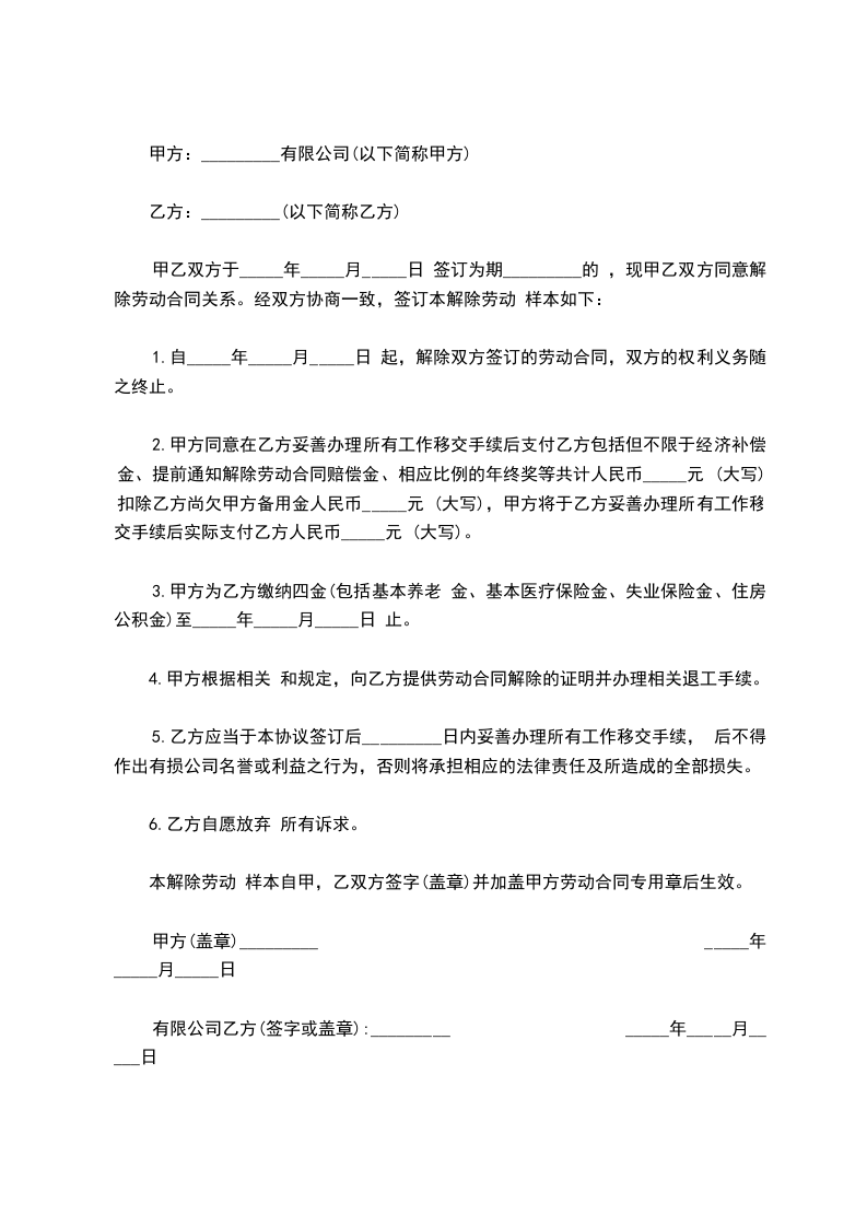 二、劳动合同于 年 月 日解除。社保、公积金缴交至____年____月止。并由甲方支付乙方一定的经济补偿金,共计____元。