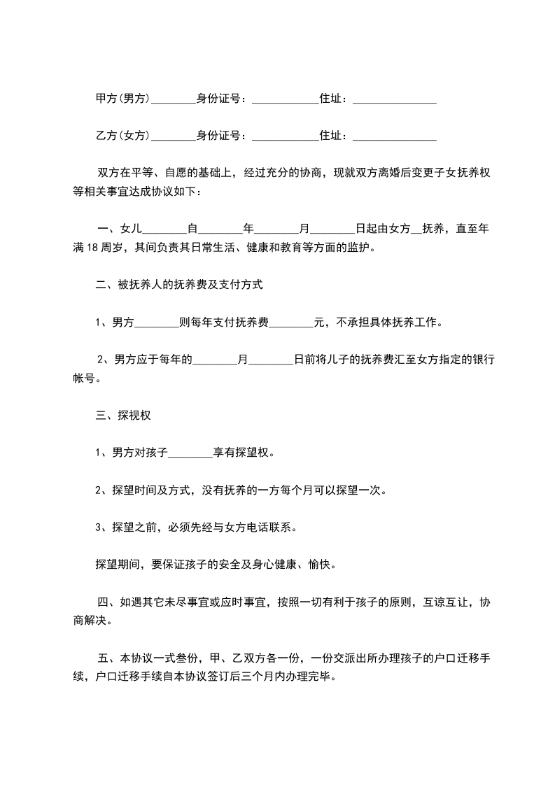 双方在平等、自愿的基础上,经过充分的协商,现就双方离婚后变更子女抚养权等相关事宜达成协议如下: