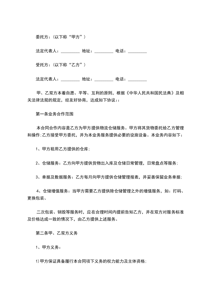 鉴于甲方有仓储物流服务需求,乙方具备提供相关服务的能力,双方经友好协商,依据《中华人民共和国民法典》等相关法律法规,就甲方委托乙方提供仓储物流服务事宜达成如下协议: