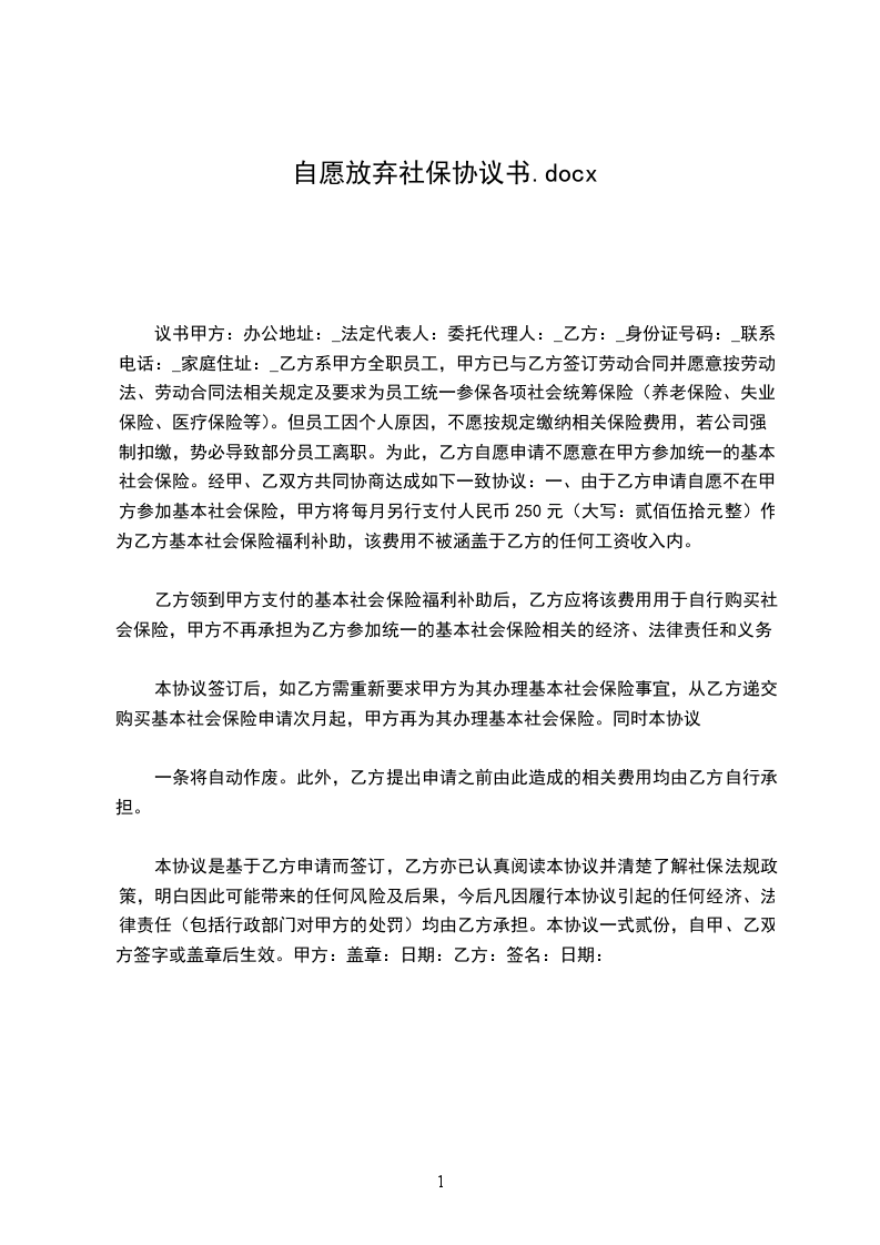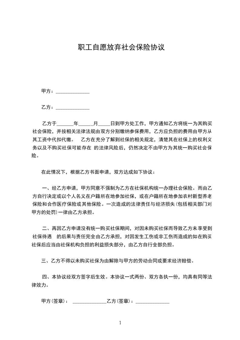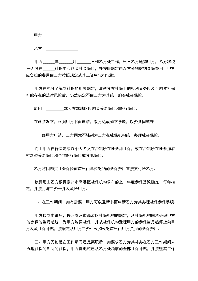 一、经甲方申请,乙方同意不强制为乙方在社保机构统一办理社会保险。