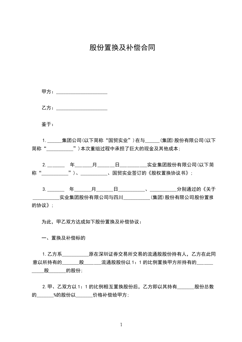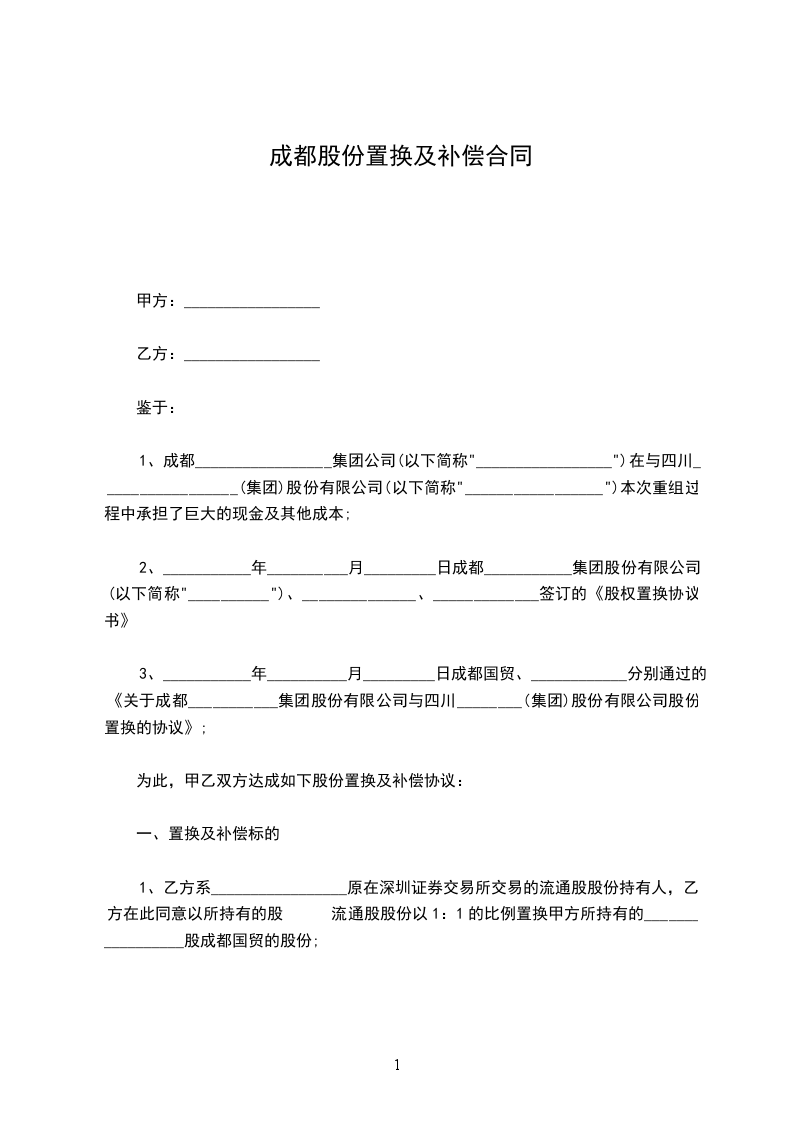 1、乙方系_________________原在深圳证券交易所交易的流通股股份持有人,乙方在此同意以所持有的股 流通股股份以1:1的比例置换甲方所持有的_________________股成都国贸的股份;