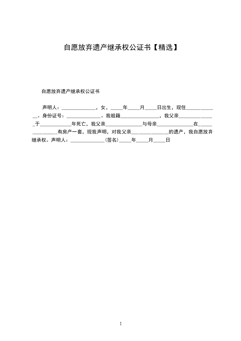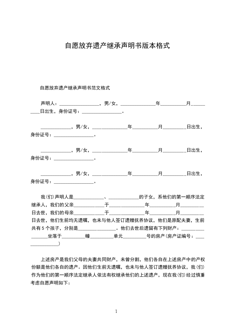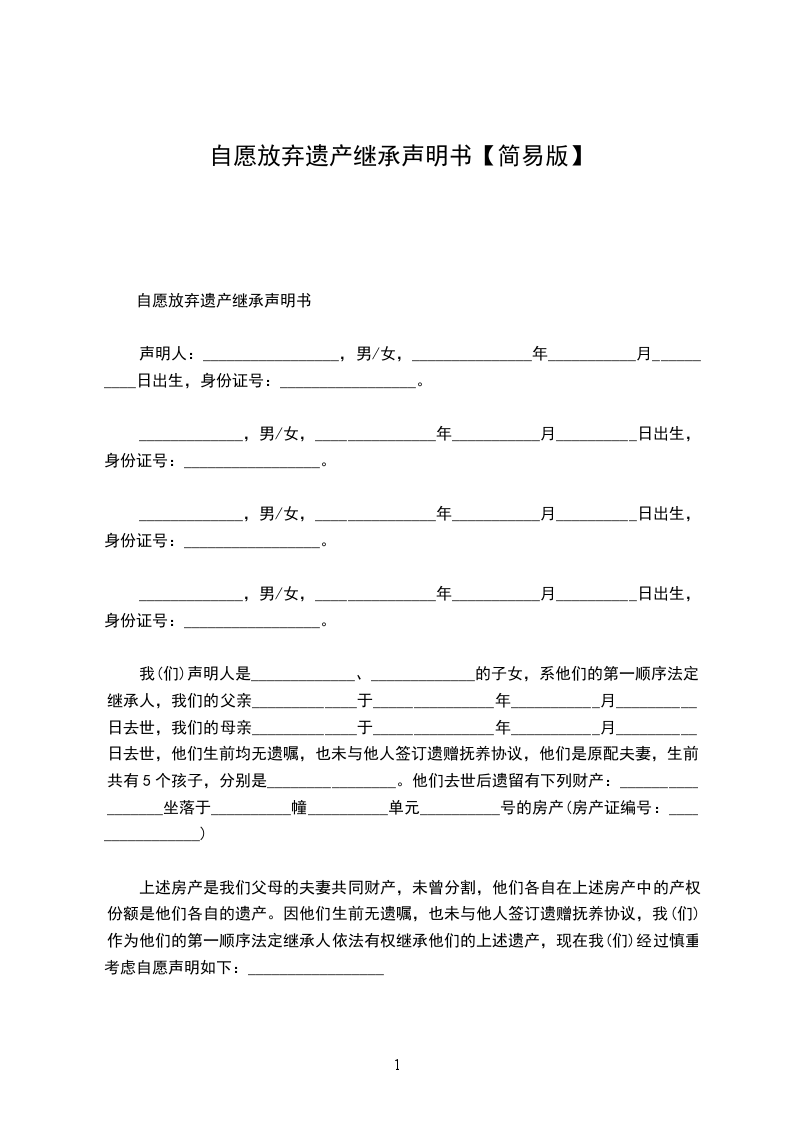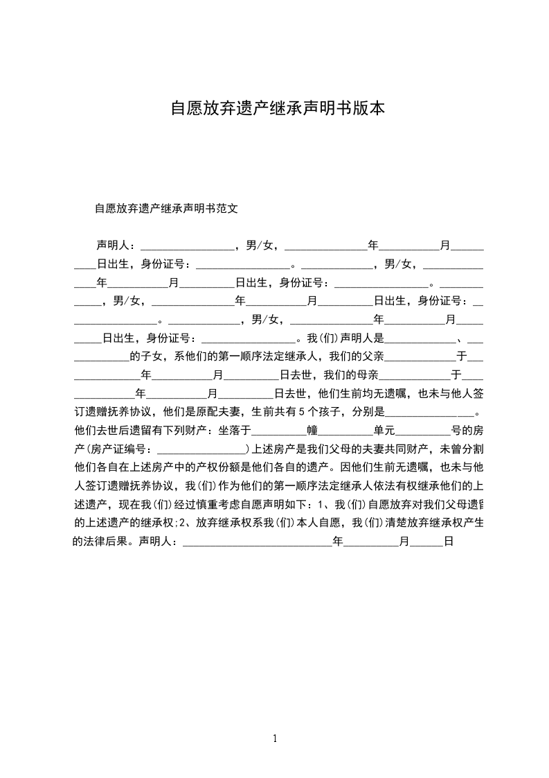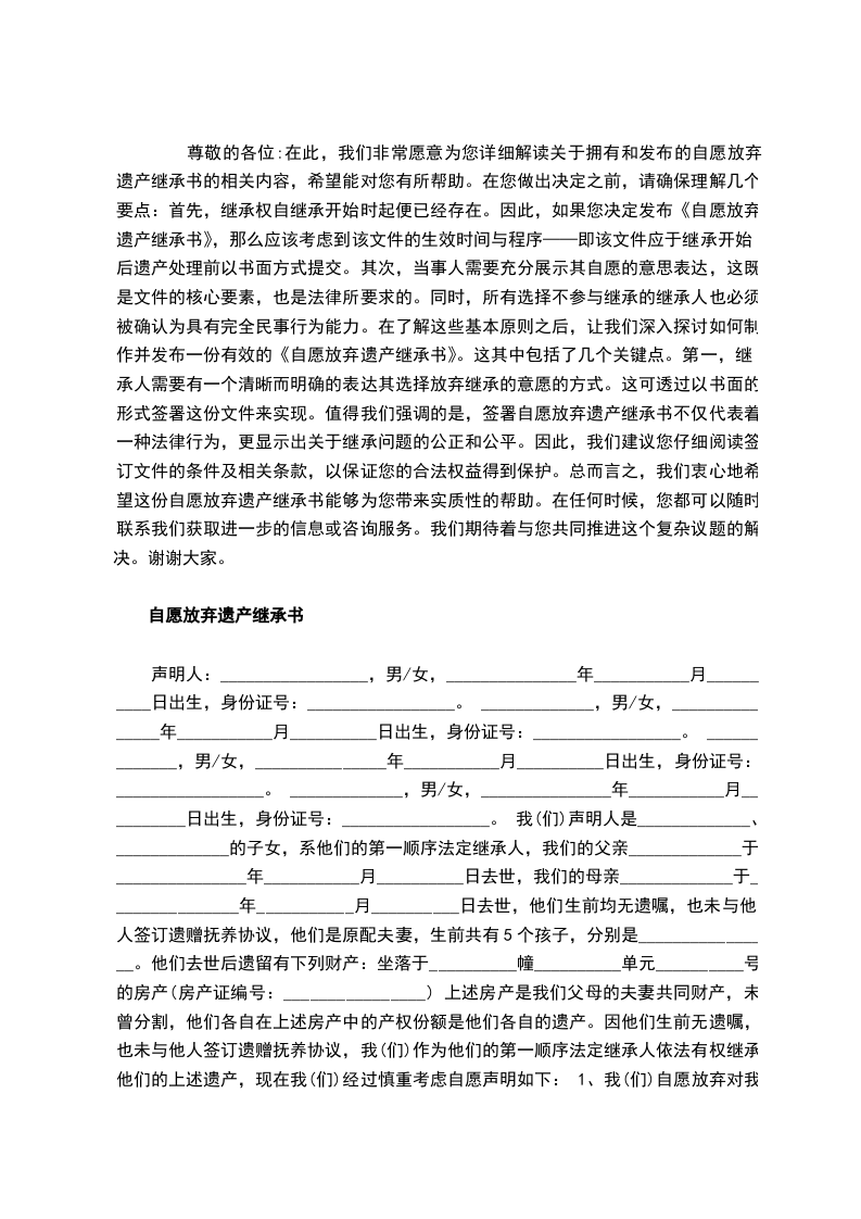 一、根据当地民俗,乙方与丁、戊、己四方确认放弃甲和乙方所有财产(包括地产、房产及其他所有财产)的所有继承权,同意所有遗产由丙方继承!乙方和丁、戊、己四方今后不能就所有遗产的任何事宜向甲方主张任何权利!