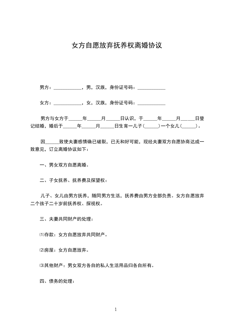 儿子、女儿由男方抚养,随同男方生活,抚养费由男方全部负责。女方自愿放弃二个孩子二十岁前抚养权、探视权。