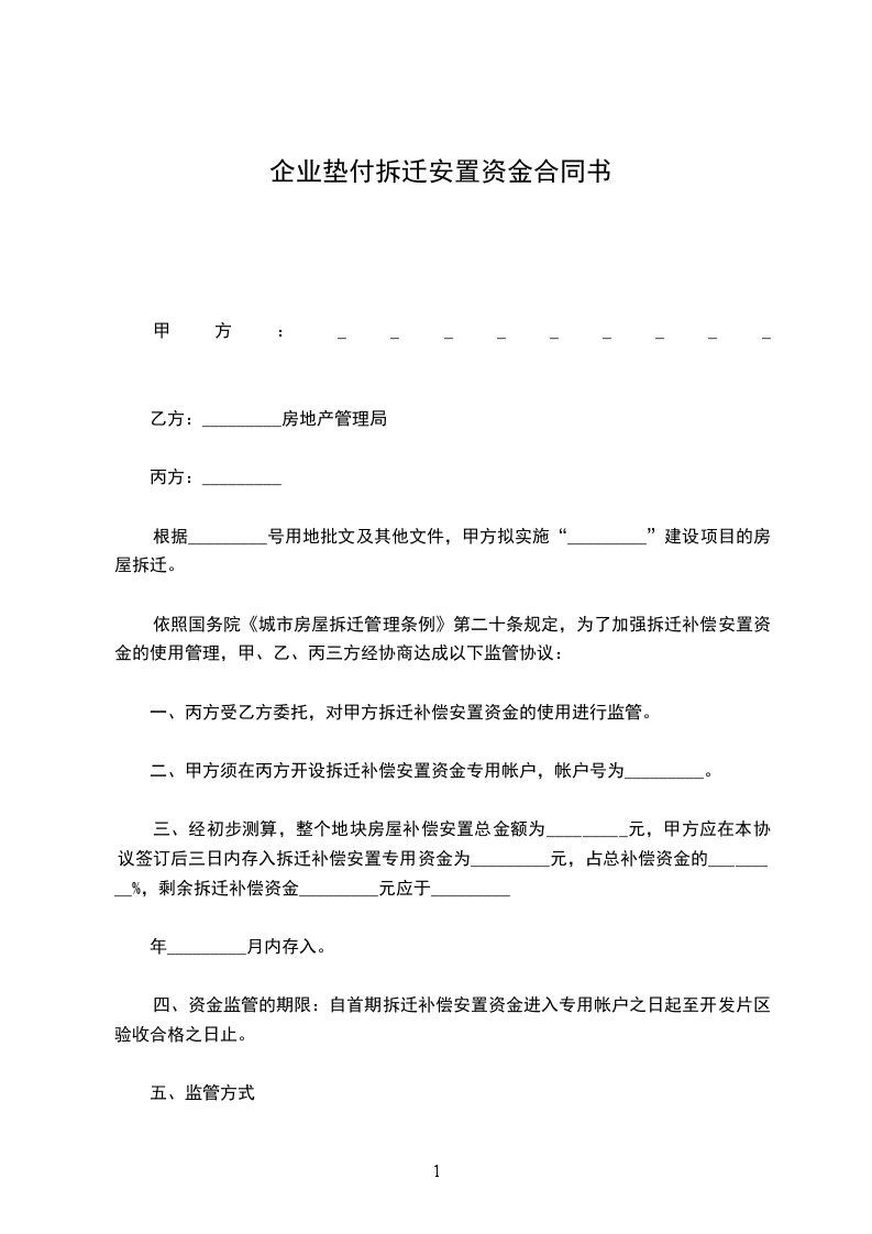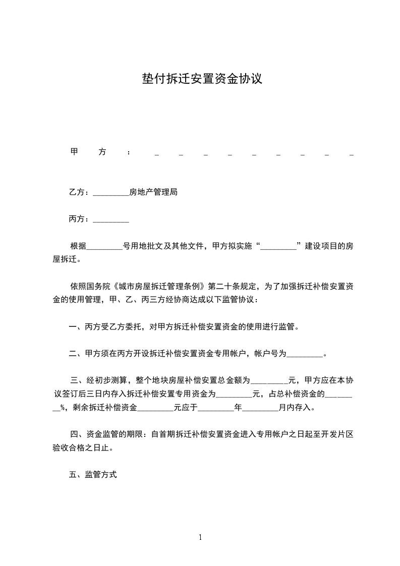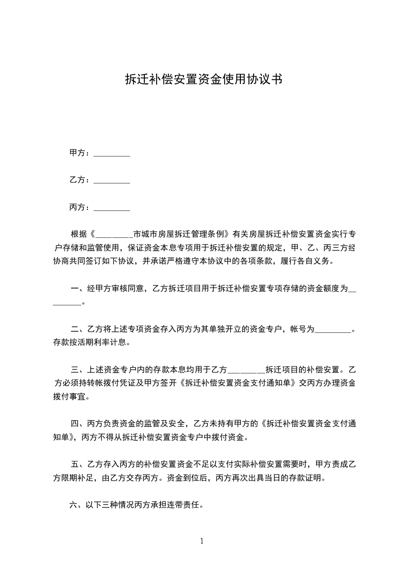三、经初步测算,整个地块房屋补偿安置总金额为_________元,甲方应在本协议签订后三日内存入拆迁补偿安置专用资金为_________元,占总补偿资金的_________%,剩余拆迁补偿资金_________元应于_________