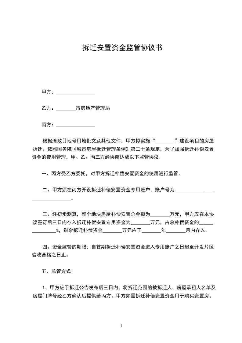 依照国务院《城市房屋拆迁管理条例》第二十条规定,为了加强拆迁补偿安置资金的使用管理,甲、乙、丙三方经协商达成以下监管协议: