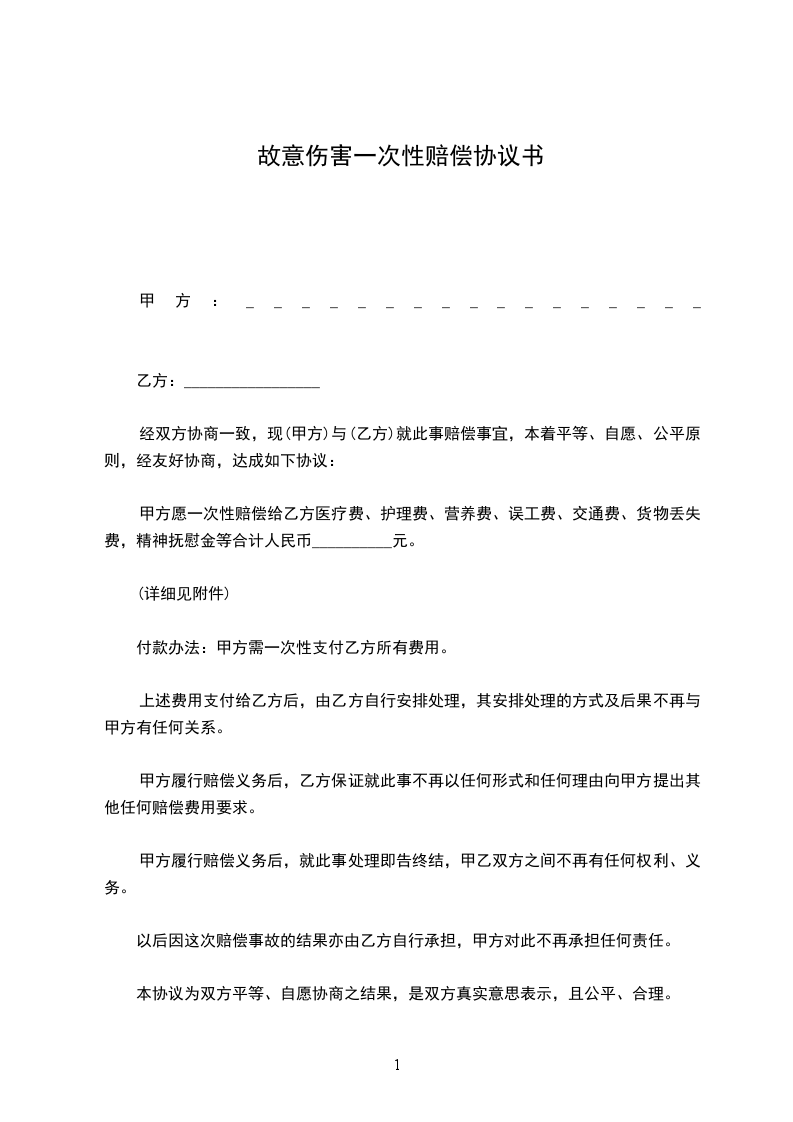 甲方愿一次性赔偿给乙方医疗费、护理费、营养费、误工费、交通费、货物丢失费,精神抚慰金等合计人民币__________元。