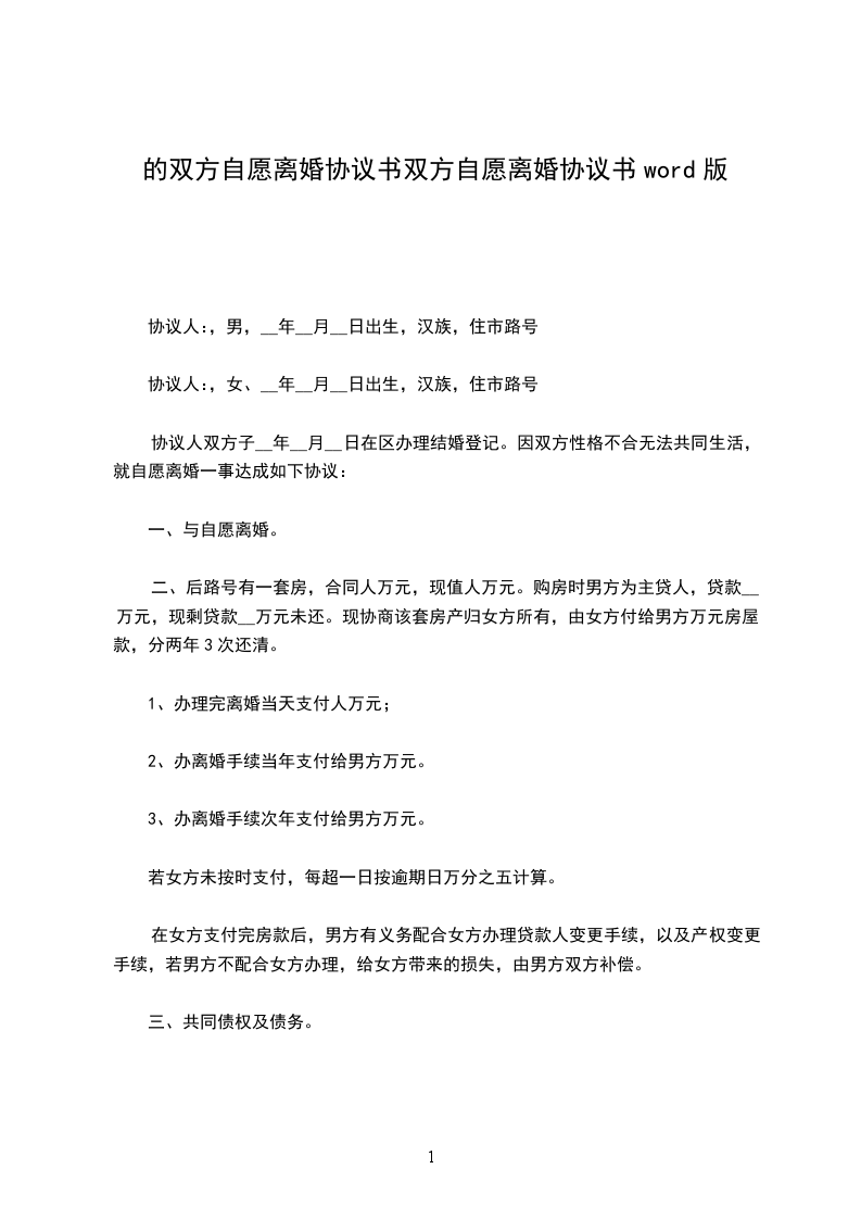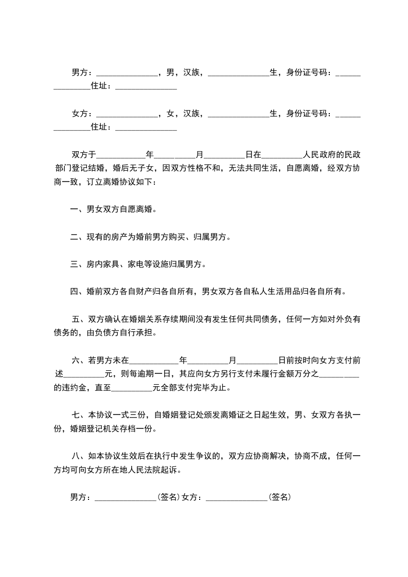 双方于____________年__________月__________日在__________人民政府的民政部门登记结婚,婚后无子女,因双方性格不和,无法共同生活,自愿离婚,经双方协商一致,订立离婚协议如下: