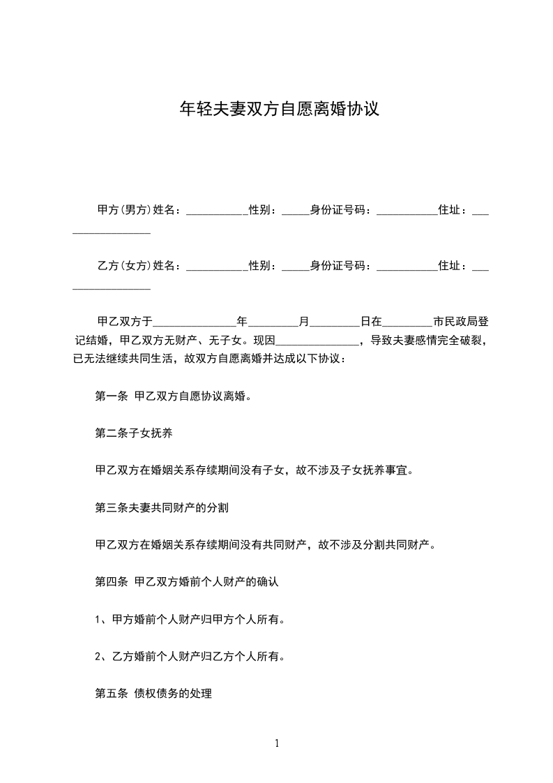协议人双方于_________年_________月_________日登记结婚,育有一子__________。