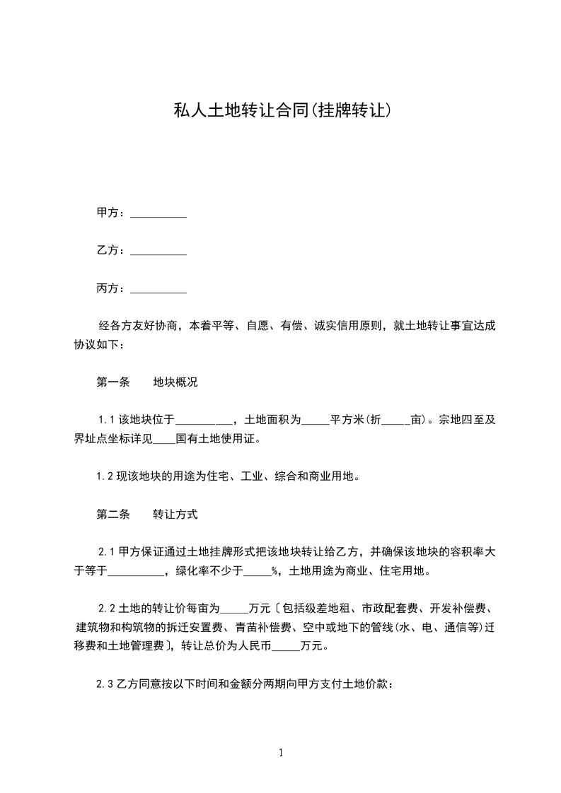 乙方:_____________丙方:_____________经各方友好协商,本着平等、自愿、有偿、诚实信用原则,就土地转让事宜达成协议如下: