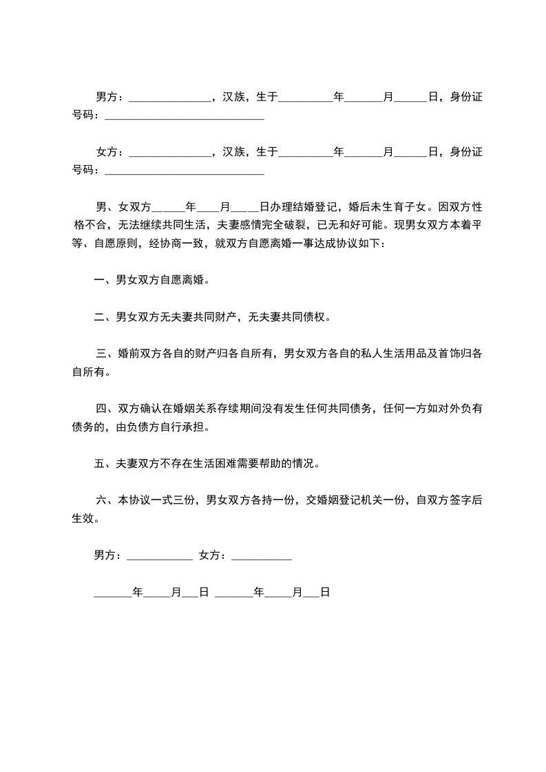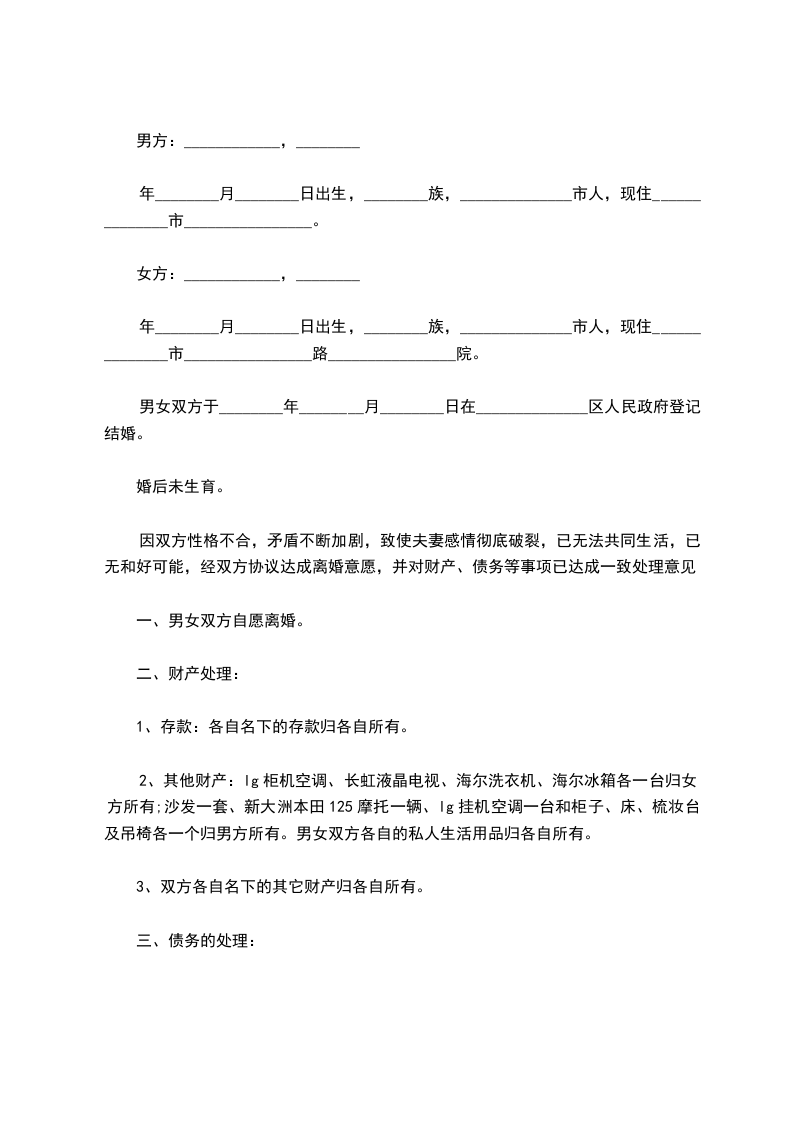 因双方性格不合,矛盾不断加剧,致使夫妻感情彻底破裂,已无法共同生活,已无和好可能,经双方协议达成离婚意愿,并对财产、债务等事项已达成一致处理意见: