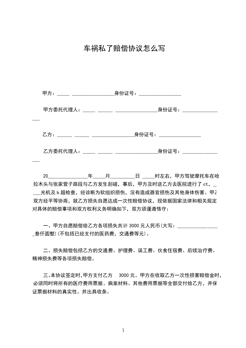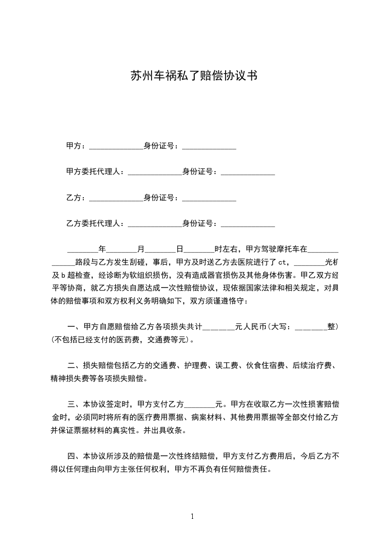 一、甲方一次性赔偿乙方赔偿金人民币_____________元(伙食补助费__________天_______________元=_______________元,误工费_______________天_______________元=_____________元,护理费__________天_____________元=_____________元),此款项不包括甲方为乙方已付医疗费(_____________元),乙方收到上述赔偿款后,此时故终结不得再向甲方主张任何权利。
