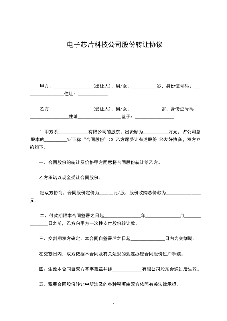 1.甲方系_____________有限公司的股东,出资额为___________万元,占公司总股本的__________%(下称“合同股份”)2.乙方愿受让有述股份;经友好协商,双方立约如下: