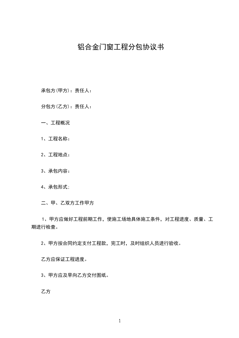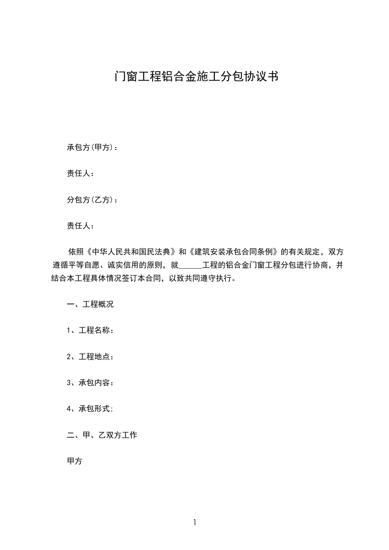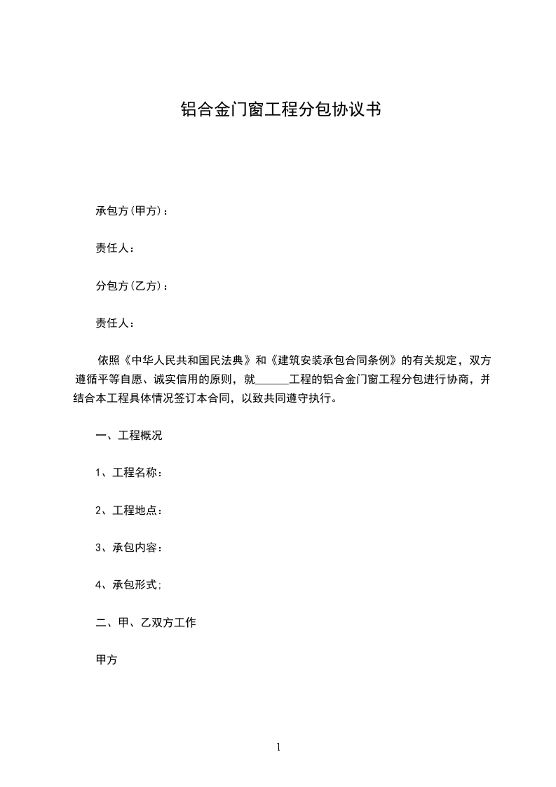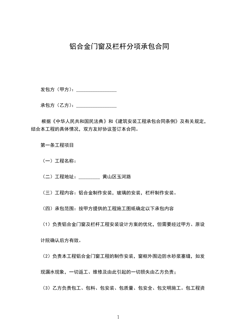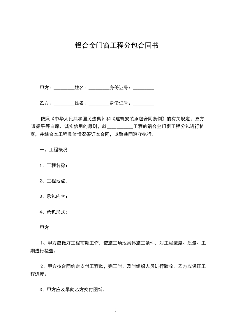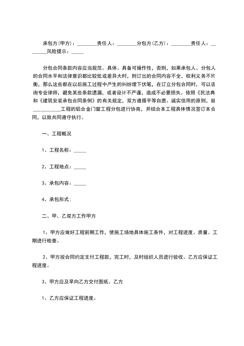依照《中华人民共和国民法典》和《建筑安装承包合同条例》的有关规定,双方遵循平等自愿、诚实信用的原则,就______工程的铝合金门窗工程分包进行协商,并结合本工程具体情况签订本合同,以致共同遵守执行。